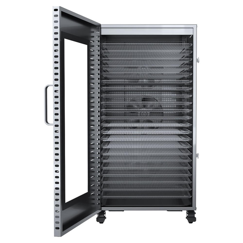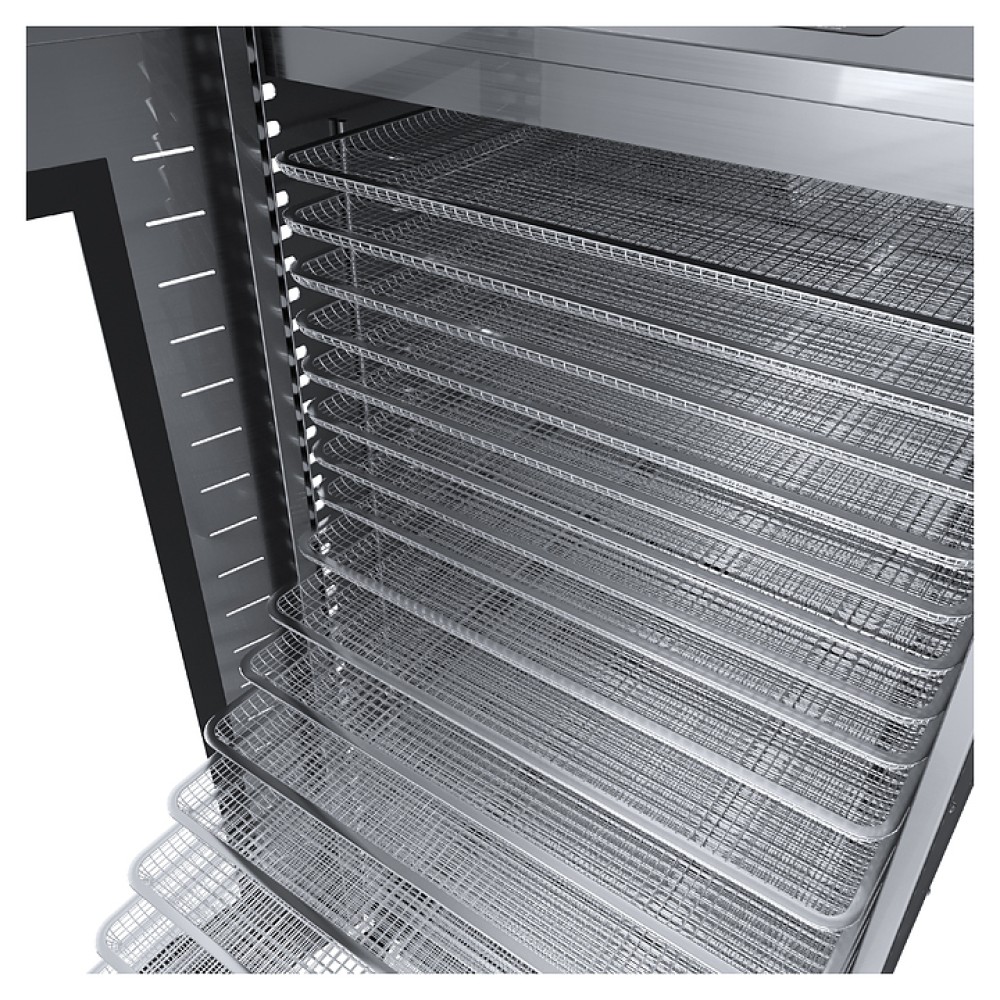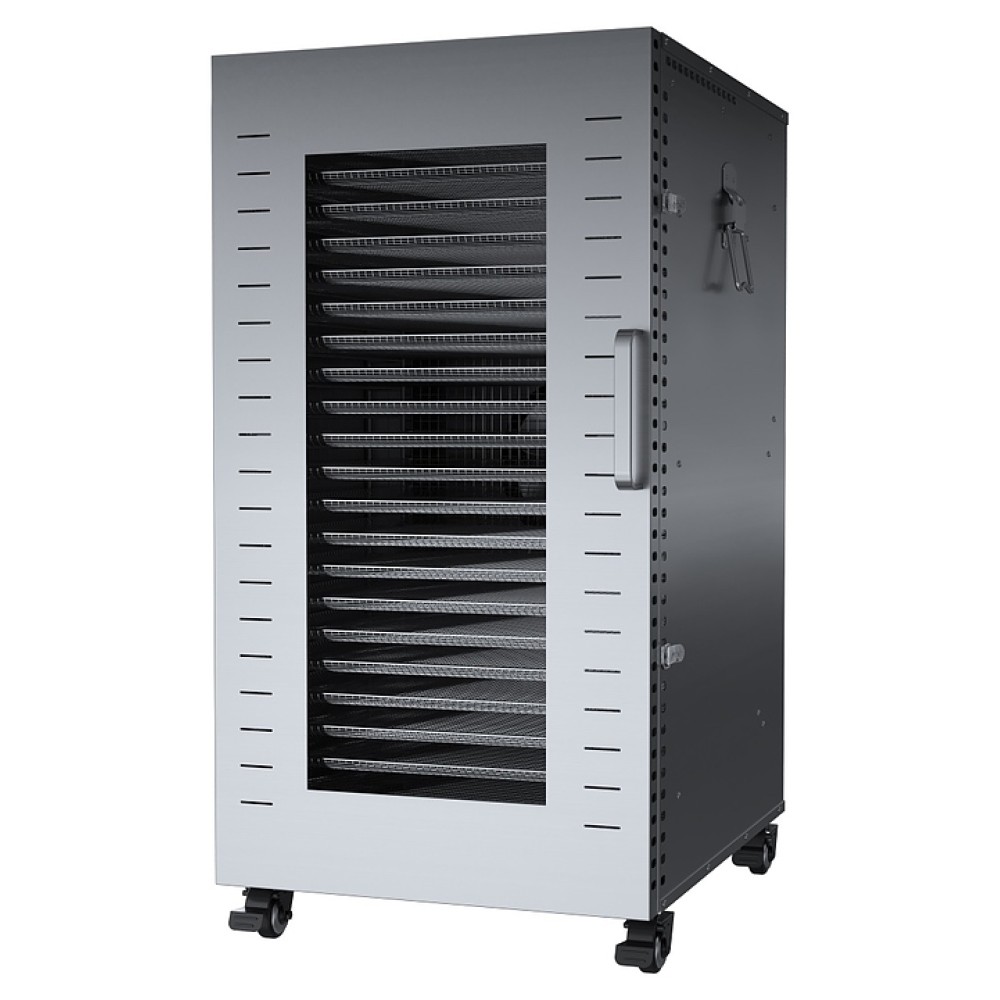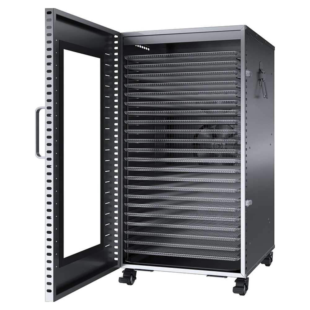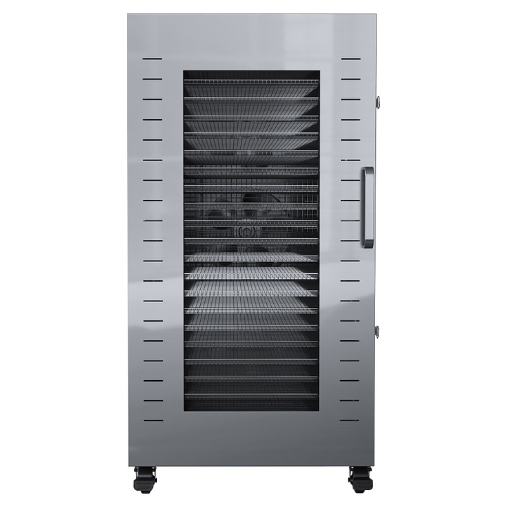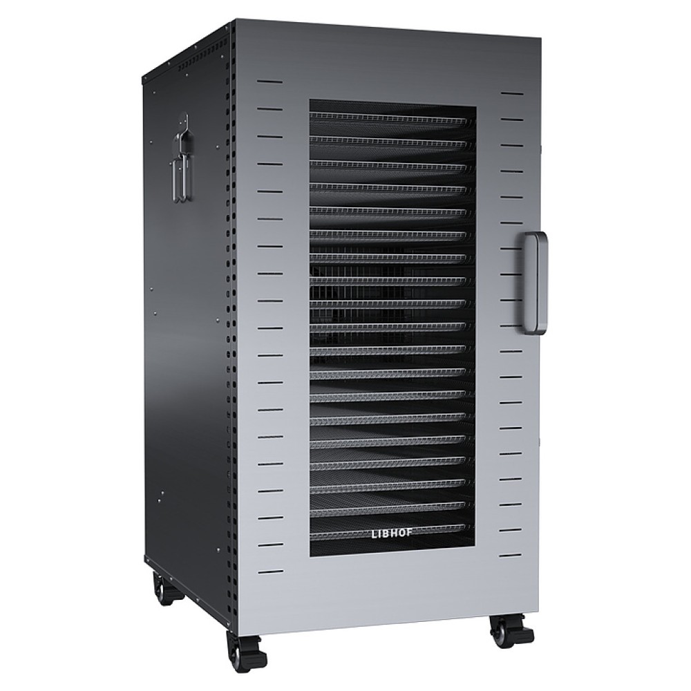 Дегидратор Libhof FDT-22 используется на предприятиях пищевой промышленности, общественного питания и торговли, а также в домашних условиях для сушки овощей, фруктов, ягод, грибов и трав, вяления рыбы, расстойки теста, приготовления сухариков, пастилы и йогурта. Модель оснащена камерой с 22 уровнями направляющих для размещения поддонов, расположенными в задней стенке вентилятором и нагревательными элементами, распашной дверью с вертикальной рукояткой, кабелем питания, расположенным на верхней панели блоком управления с сенсорной клавиатурой и цифровым дисплеем. Корпус и поддоны выполнены из высококачественной нержавеющей стали.