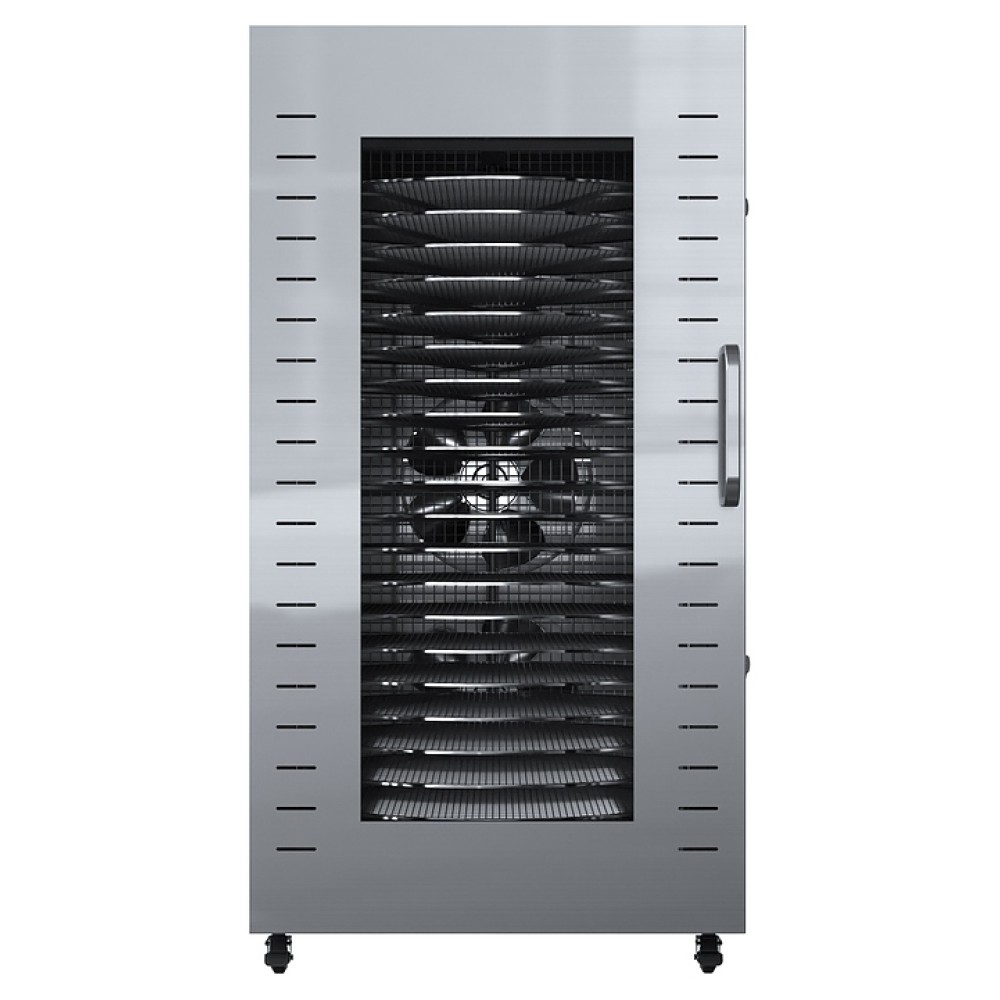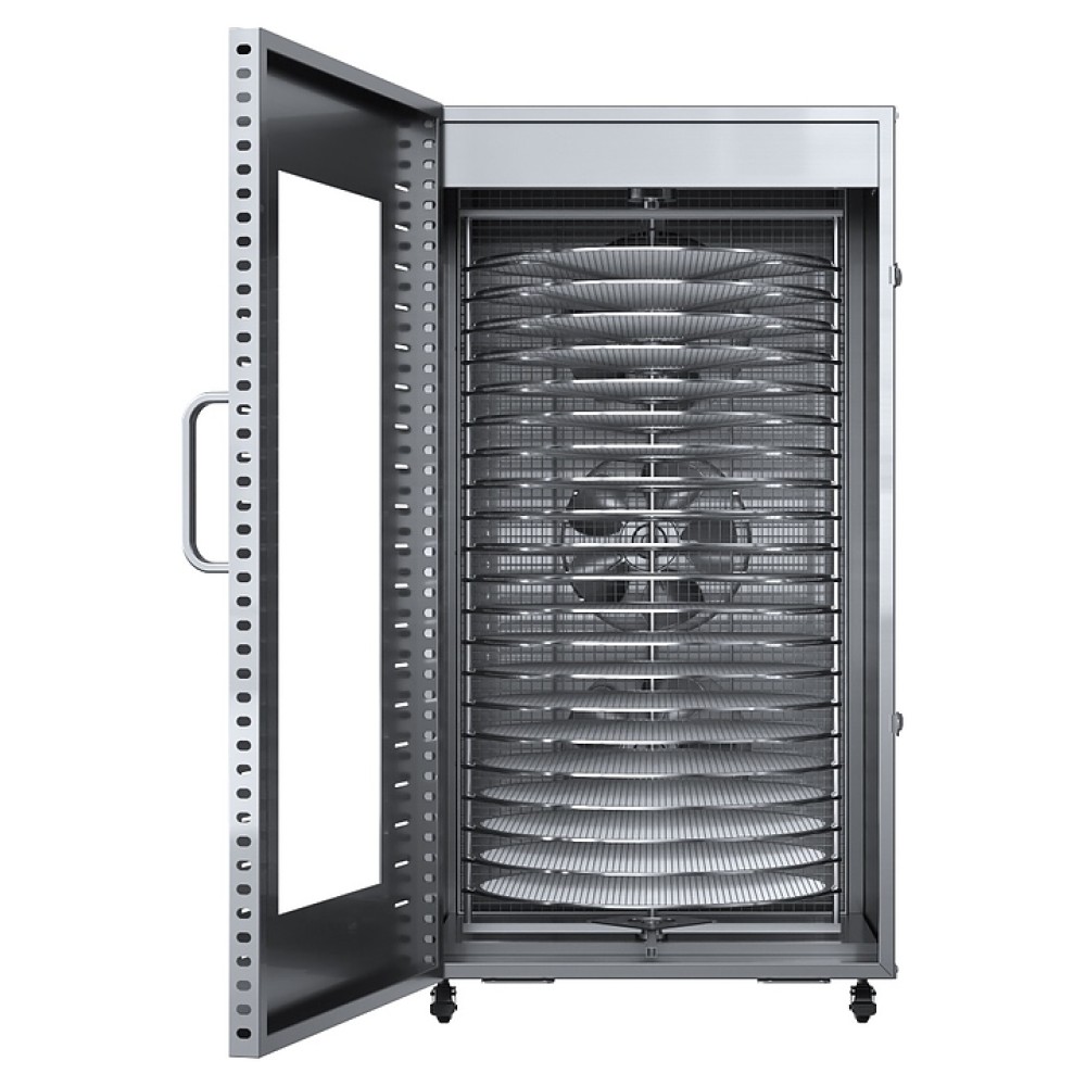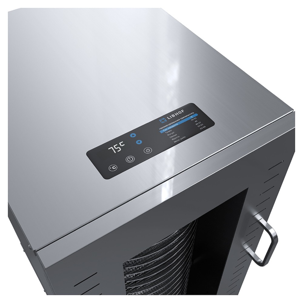 Дегидратор Libhof FDT-22 используется на предприятиях пищевой промышленности, общественного питания и торговли, а также в домашних условиях для сушки овощей, фруктов, ягод, грибов и трав, вяления рыбы, расстойки теста, приготовления сухариков, пастилы и йогурта. Модель оснащена камерой с 22 уровнями направляющих для размещения поддонов, расположенными в задней стенке вентилятором и нагревательными элементами, распашной дверью с вертикальной рукояткой, кабелем питания, расположенным на верхней панели блоком управления с сенсорной клавиатурой и цифровым дисплеем. Корпус и поддоны выполнены из высококачественной нержавеющей стали.