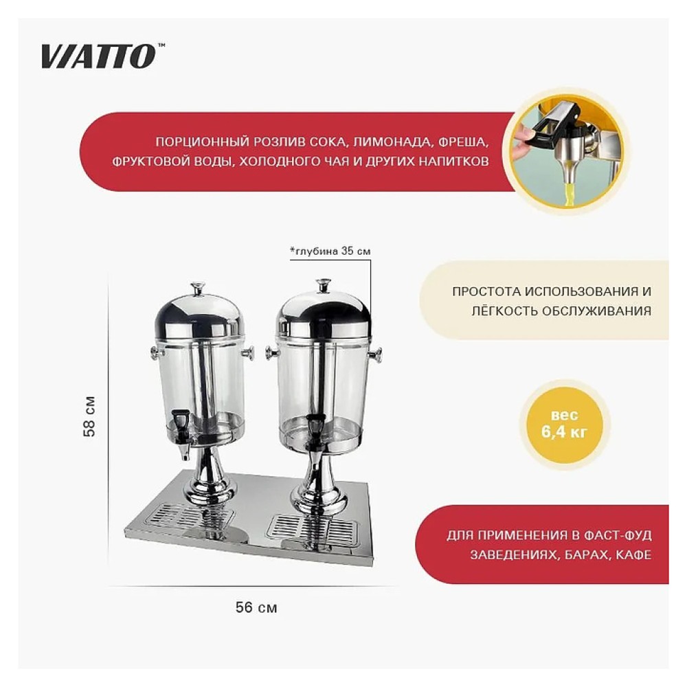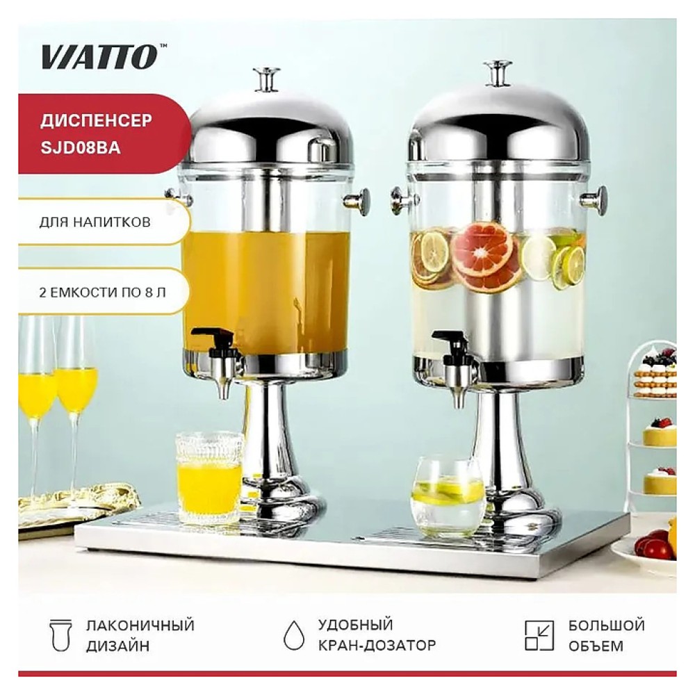 Диспенсер для сока VIATTO SJD08BA используется на предприятиях общественного питания и торговли, а также при выездном обслуживании для порционного розлива сока и других холодных напитков. Корпус выполнен из нержавеющей стали, емкость - из прозрачного поликарбоната.