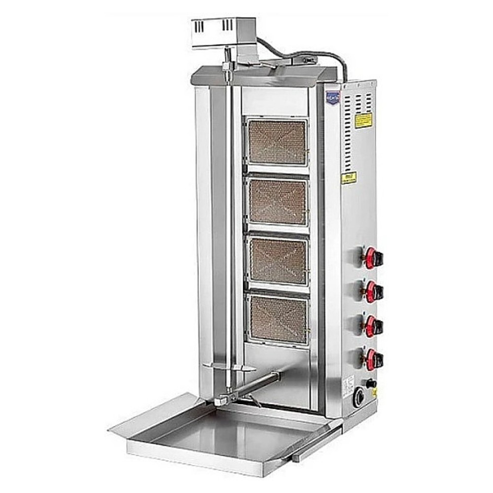 Гриль для шаурмы Eletto D08MZ предназначен для обжарки различных типов и видов мяса в больших количествах на предприятиях общественного питания: в барах, кафе, закусочных и бистро. Модель оснащена 4 зонами нагрева, электрическим приводом и поддоном для жира. Корпус выполнен из нержавеющей стали.