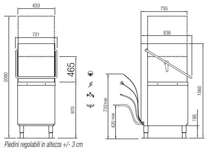 Купольная посудомоечная машина Elettrobar RIVER 83CDE используется на предприятиях общественного питания для мытья стаканов, посуды и кухонной утвари, а также подносов и гастроемкостей. Модель оснащена сенсорной панелью управления, атмосферным бойлером с помпой ополаскивания и регулируемыми по высоте ножками.