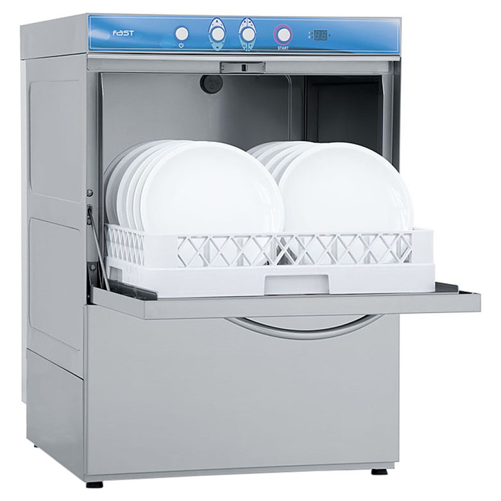 Посудомоечная машина с фронтальной загрузкой Elettrobar FAST 60DE используется на предприятиях общественного питания для мытья стаканов, посуды и кухонной утвари. Модель оснащена электромеханической панелью управления со световыми индикаторами и перистальтическим дозатором ополаскивающего средства.