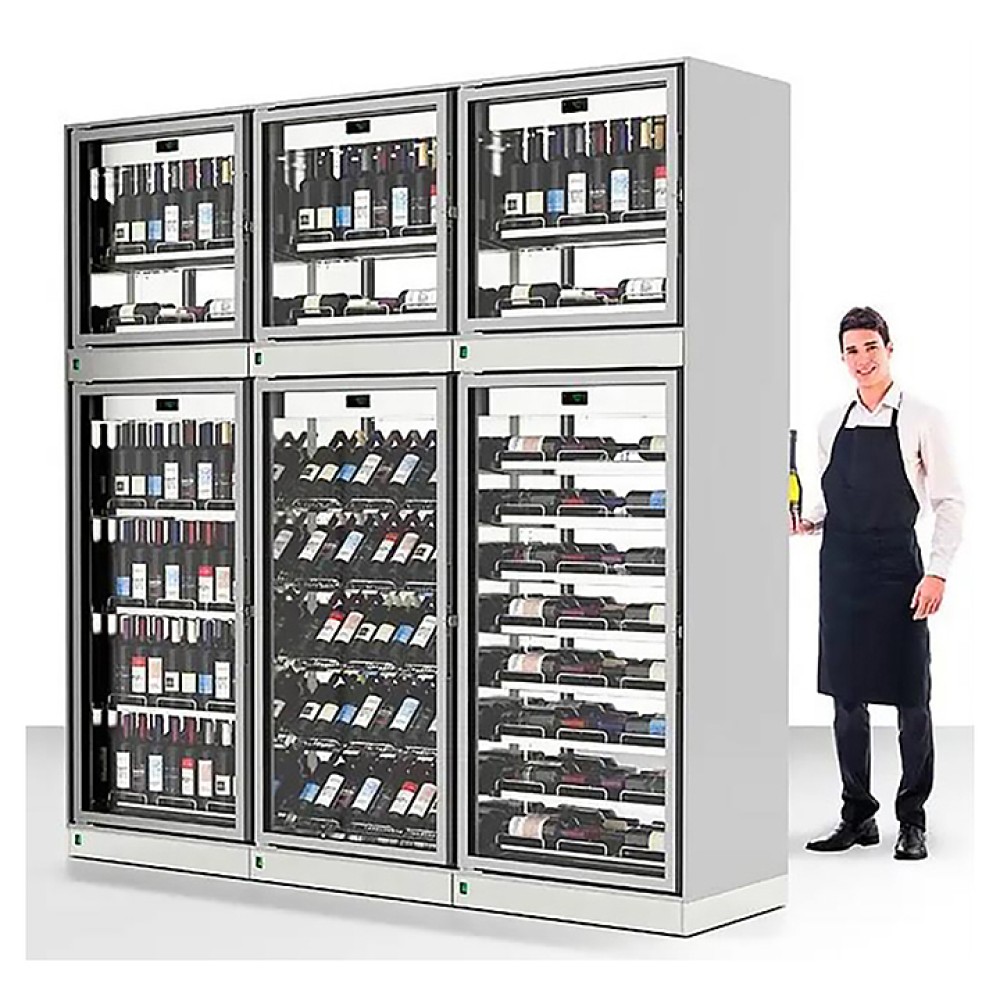 Винный шкаф Enofrigo H2000 GM5C1V модульной системы ENOGALAX предназначен для хранения вина при определенном уровне влажности и температуры в ресторанах, специализированных магазинах, отелях, подсобных складских помещениях, в частных домах или квартирах. Модель оснащена 1 дверью и глухой задней стенкой. Корпус выполнен из ламината, рама двери - из анодированного алюминия, дверь из низкоэмисионного стекла, полки - из поликарбоната и нержавеющей стали.