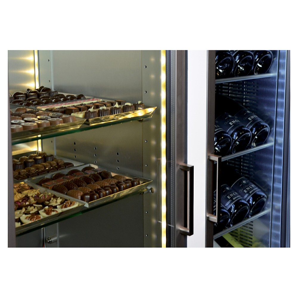 Модель оборудована инновационной системой охлаждения на основе установки охлаждающего элемента в центре витрины. Низкое энергопотребление достигается благодаря эксклюзивной системе энергосбережения, дверям с двойным остеклением и раздельным зонам, что позволяет открывать по необходимости только одну из дверей. Шкаф можно перевести в режим энергосбережения всего одним нажатием кнопки.