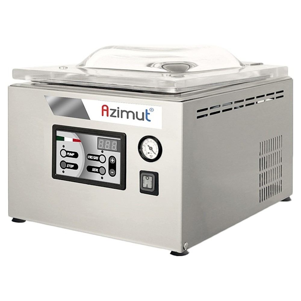 Вакуумный упаковщик Azimut C 254 используется на предприятиях общественного питания и торговли, в пекарнях и кондитерских для упаковки готовых блюд и продуктов в вакуумную упаковку для увеличения срока хранения. Модель оснащена вакуумным насосом DVP LC4 O.E.M беспроводной запаивающей планкой на пневматическом поршне, панелью управления с 6 функциональными кнопками, 4 светодиодными индикаторами и 3-значным цифровым дисплеем, а также аналоговым вакуумметром. Камера и корпус выполнены из нержавеющей стали AISI 201, крышка – из плексигласа.