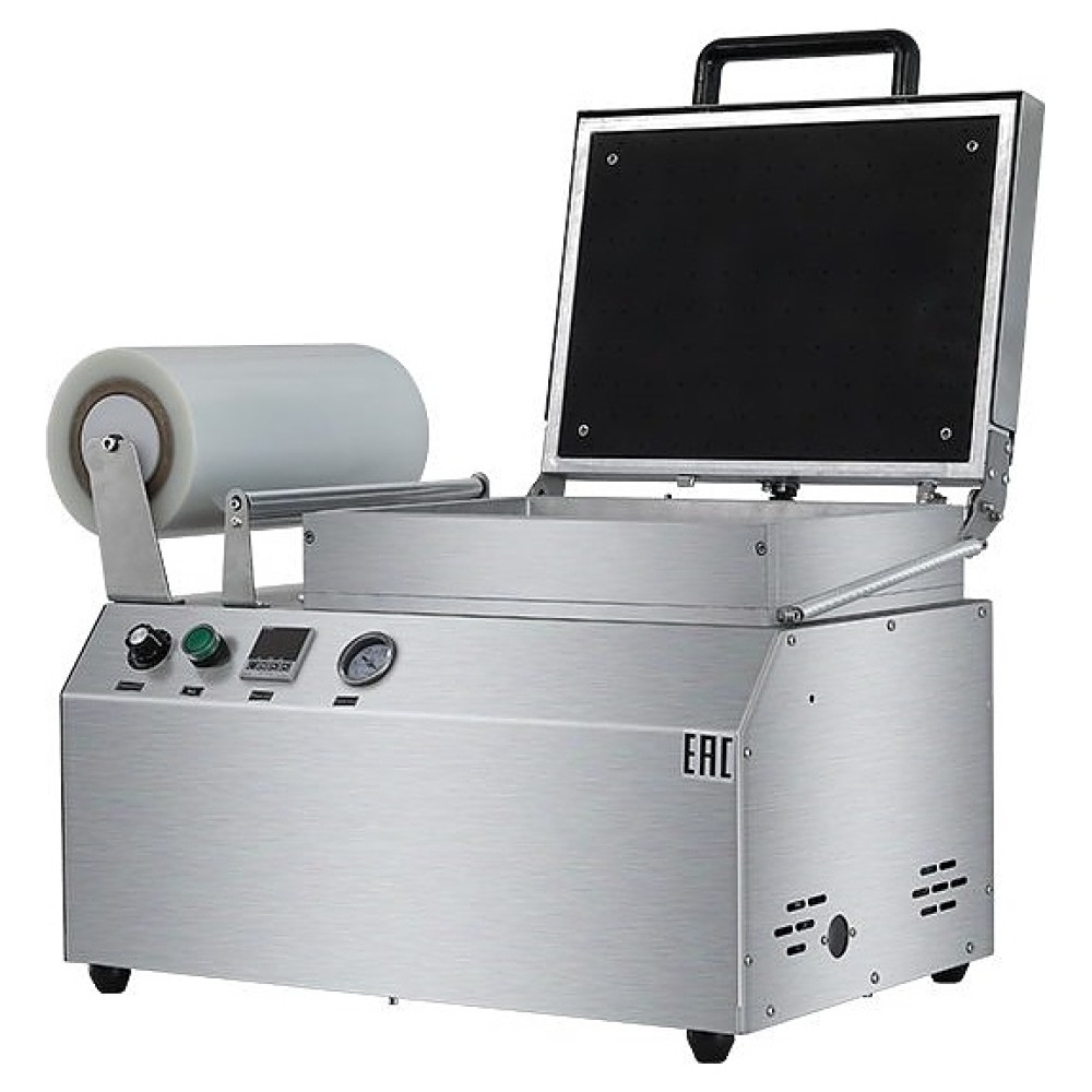 Вакуумный ручной скин-упаковщик Hualian HLV-300VST premium используется на предприятиях пищевой промышленности, общественного питания и торговли для герметичной упаковки готовых блюд, полуфабрикатов, сыров, фруктов и других пищевых продуктов в лотках или на поддонах под плотно облегающую поверхность скин-пленку для сохранения свежести, предотвращения размножения микроорганизмов и смешивания запахов. Модель оснащена вакуумной камерой с верхней откидной крышкой, держателем для рулона с пленкой слева от камеры и наклонной фронтальной электромеханической панелью управления. Камера и корпус выполнены из высококачественной нержавеющей стали.
