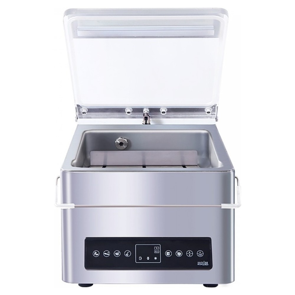 Настольный вакуумный упаковщик Hualian HVC-210T/1D используется на малых предприятиях общественного питания и торговли, а также в домашних условиях для упаковки готовых блюд и пищевых продуктов в герметичную тару для сохранения свежести, предотвращения размножения микроорганизмов и смешивания запахов. Модель оснащена вакуумным насосом, объемной камерой с 1 продольно ориентированной запаечной планкой, расположенной сверху откидной крышкой с эластичными манжетой по периметру и прижимным уплотнением, фронтальной наклонной сенсорной панелью управления и светодиодным цифровым дисплеем. Корпус и камера выполнены из нержавеющей стали, крышка – из высокопрочного органического стекла, уплотнение двери – из силикона, панель управления с покрытием из закаленного стекла.