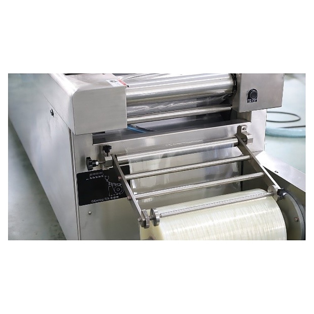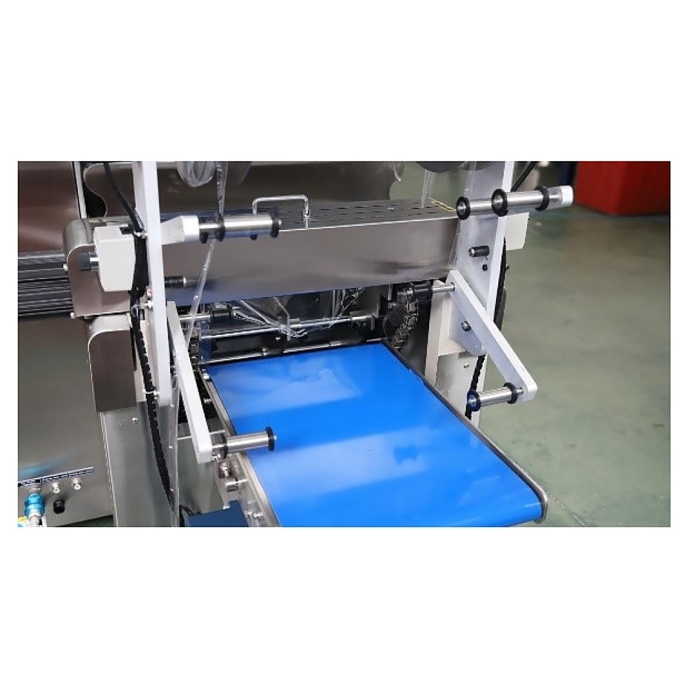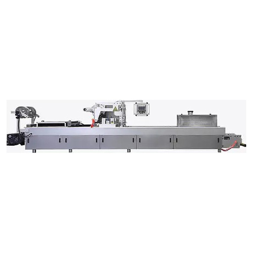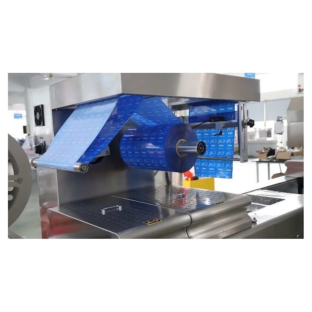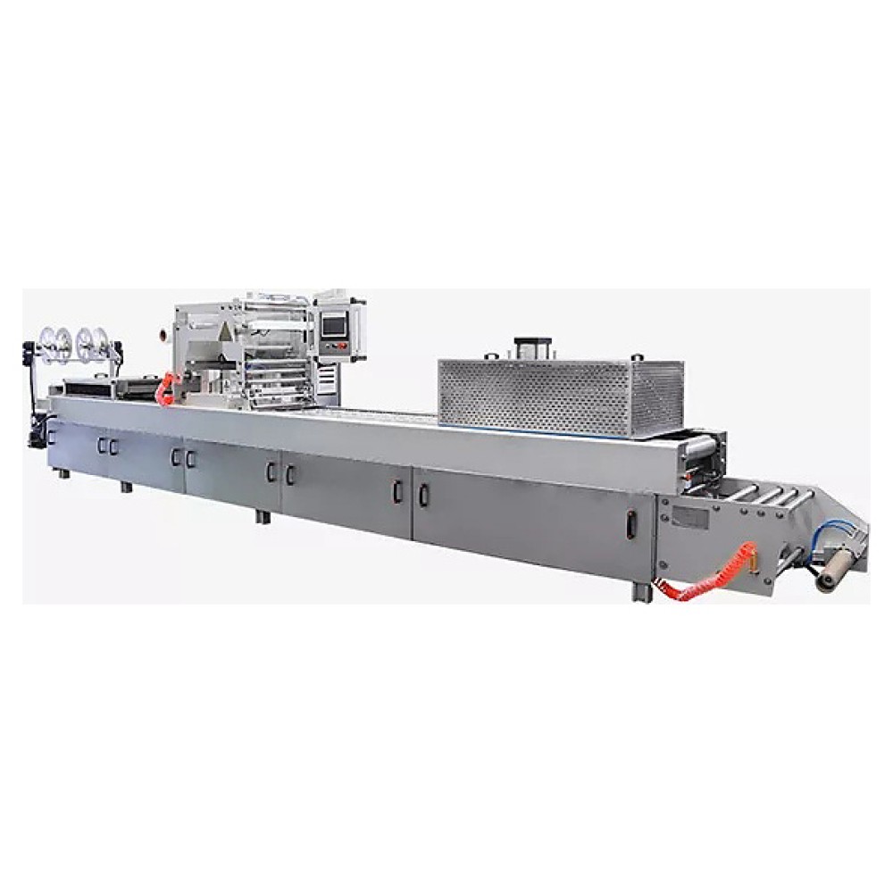 Принцип работы: Верхняя и нижняя части упаковки используют эластичную плёнку, верхняя плёнка - композитную плёнку, нижняя плёнка - стрейч, сначала цепной транспортёр перемещает нижнюю плёнку в формирующую матрицу, растягивает нижнюю плёнку в узле формирования, затем в зоне формирования закладывается продукция, после этого отправляется в запаивающий узел, где сформированный лоток запаивается плёнкой сверху и вакуумируется (некоторые продукты вакуумируются на основе азота), также машина автоматически совершает горизонтальную и вертикальную обрезку для разделения сформированных упаковок.