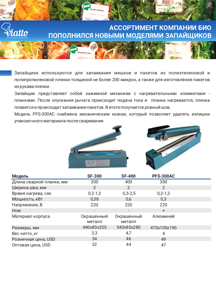 Запайщик пакетов VIATTO PFS-300AC используется на предприятиях общественного питания и торговли для для запаивания мешков и пакетов из полиэтиленовой и полипропиленовой пленки, а также для изготовления пакетов из рукава пленки. Модель оснащена механическим ножом для удаления излишков упаковочного материала после сваривания. Корпус выполнен из алюминия.