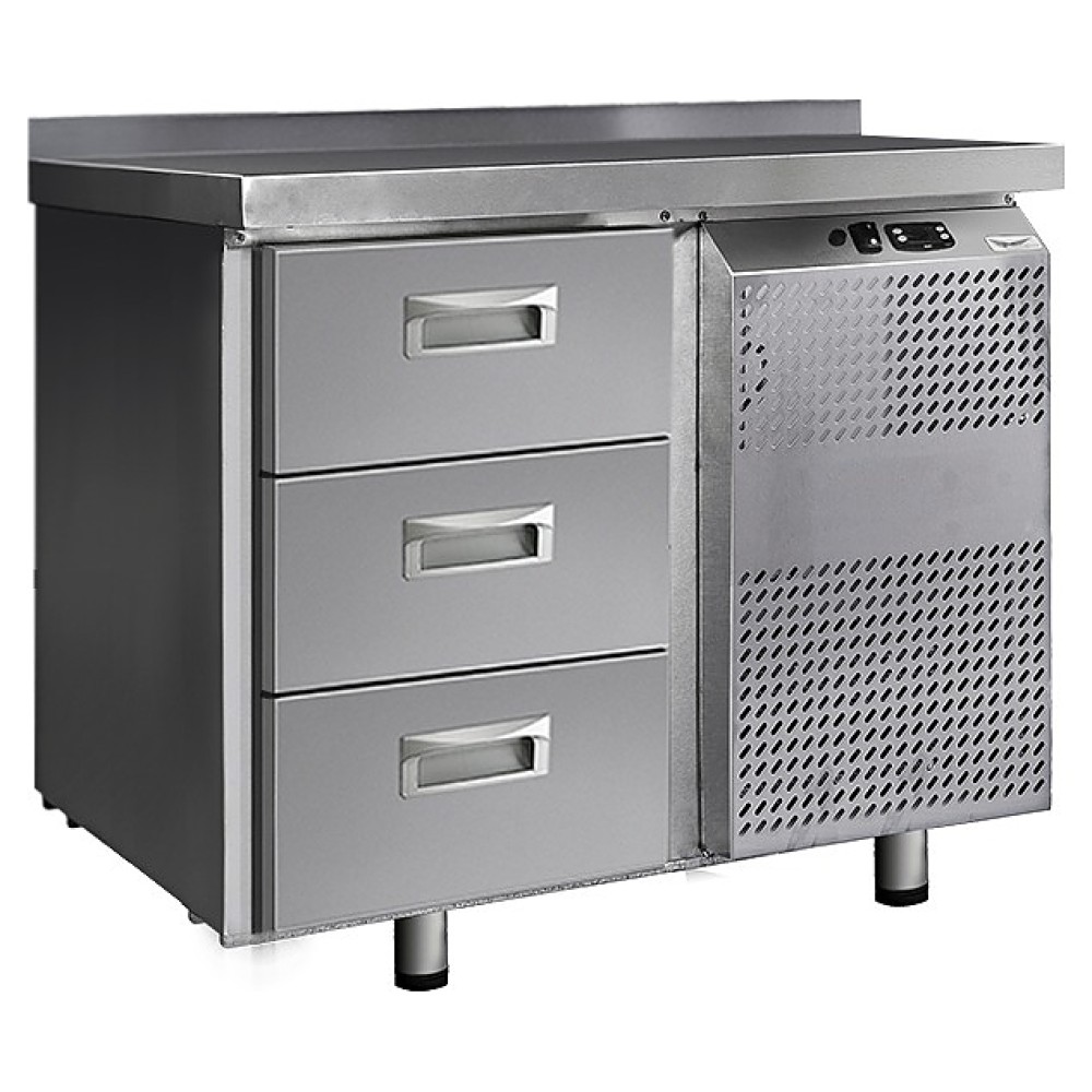 Холодильный стол Finist СХС-700-0/3 предназначен для хранения предварительно охлажденных мясных и рыбных полуфабрикатов, заготовок для салатов, молочной продукции, охлажденных напитков и других пищевых продуктов на предприятиях общественного питания и торговли. Модель оснащена расположенным сбоку агрегатным отсеком, столешницей с задним бортом, 3 выдвижными ящиками, устойчивыми ножками с подпятниками, кабелем питания с евровилкой и кнопочной панелью управления с цифровым дисплеем. Корпус выполнен из высококачественной нержавеющей стали.