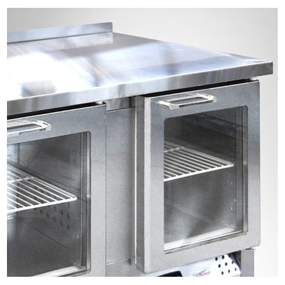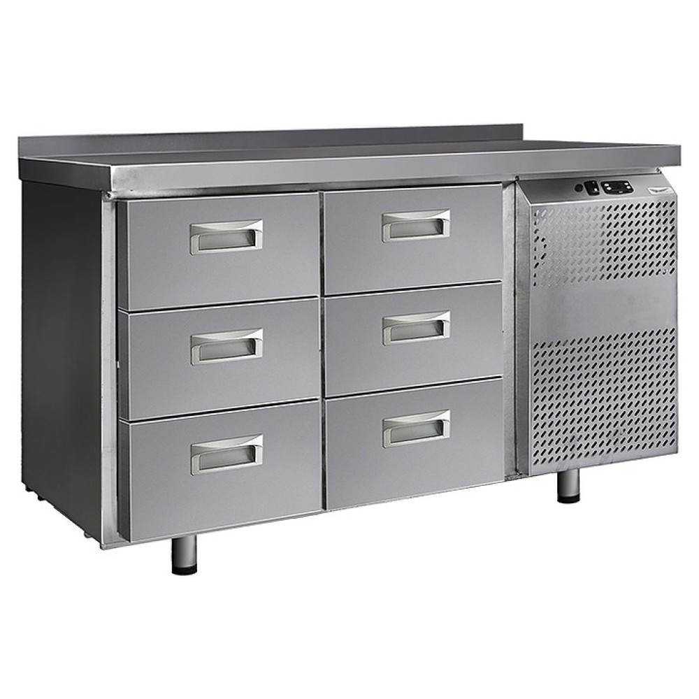 Холодильный стол Finist СХС-700-0/6 предназначен для хранения предварительно охлажденных мясных и рыбных полуфабрикатов, заготовок для салатов, молочной продукции, охлажденных напитков и других пищевых продуктов на предприятиях общественного питания и торговли. Модель оснащена расположенным сбоку агрегатным отсеком, столешницей с задним бортом, 6 выдвижными ящиками, устойчивыми ножками с подпятниками, кабелем питания с евровилкой и кнопочной панелью управления с цифровым дисплеем. Корпус выполнен из высококачественной нержавеющей стали.