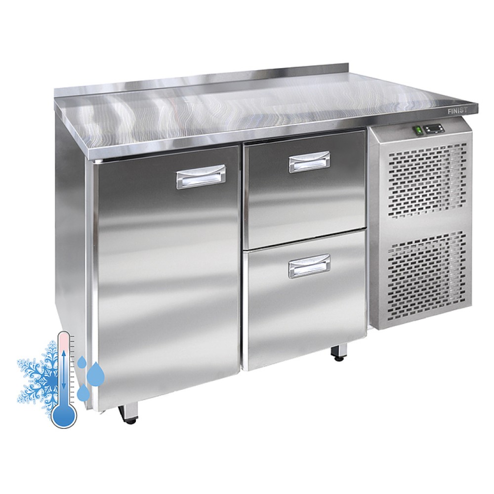 Универсальный холодильный стол Finist УХС-600-1/2 предназначен для хранения пищевых продуктов и напитков на предприятиях общественного питания, торговли и пищевых производствах. Модель оснащена распашной дверью и 2 выдвижными ящиками с доводчиками, обеспечивающими гарантированное закрытие и поддержание заданной температуры в рабочем объеме стола. Передняя панель моторного отсека имеет большую площадь перфорации, что позволяет обеспечить холодильному агрегату поступление воздуха для охлаждения. Изделие выполнено из высококачественной пищевой нержавеющей стали, которая отличается прочностью и долговечностью, не впитывает загрязнения и легко очищается.