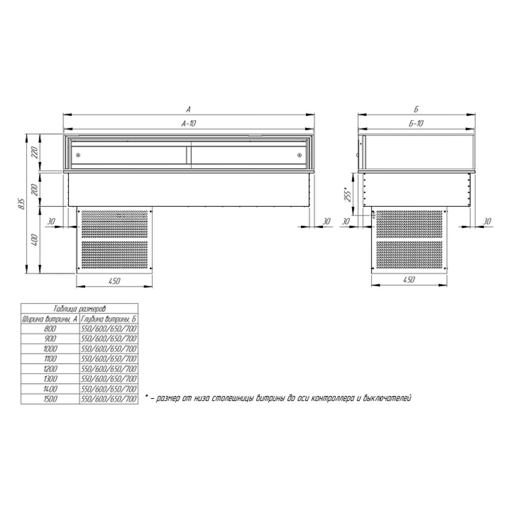 Встраиваемая витрина Finist GLASSIER Gс-12/55/2.2 предназначена для кратковременного хранения и предпродажной демонстрации шоколада, конфет и прочих небольших кондитерских изделий на предприятиях общественного питания и торговли. Модель оснащена охлаждаемой камерой-накопителем, раздвижными дверьми-купе и светодиодной подсветкой. Витрина может монтироваться в столешницу из любого материала. Зона выкладки выполнена из высококачественной зеркальной нержавеющей стали, агрегатная часть - из оцинкованной стали, корпус - из просветленного стекла, позволяющего рассмотреть товар со всех сторон.