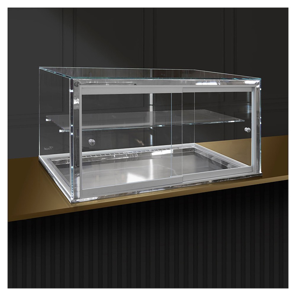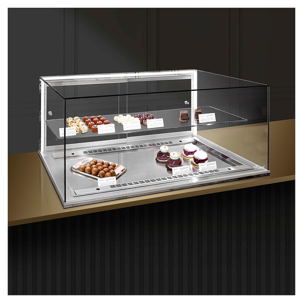 Встраиваемая горизонтальная витрина Finist Glassier G812-8/5/5 предназначена для кратковременного хранения и предпродажной демонстрации десертов, шоколадных изделий, конфет или пралине на предприятиях общественного питания и торговли. Модель оснащена 2 дверьми со стороны продавца, полкой, светодиодной подсветкой и может монтироваться в столешницу из любого материала. Купол витрины имеет большую площадь остекления, что помогает беспрепятственно разглядеть товар со всех сторон. Каркас и столешница выполнены из зеркальной нержавеющей стали, купол - из просветленного стекла, полка - из стекла и агрегатная часть - из крашеной стали.