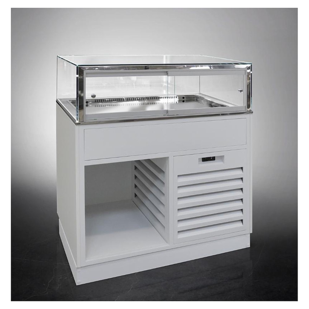 Напольная кондитерская витрина Finist GLASSIER LUX GL812-12/55/5 предназначена для кратковременного хранения и предпродажной демонстрации десертов и кондитерских изделий на предприятиях общественного питания и торговли. Модель оснащена охлаждаемой камерой-накопителем, раздвижными дверьми-купе, полкой и светодиодной подсветкой. Фасады выполнены из МДФ, купол - из просветленного стекла, дно - из нержавеющей стали.