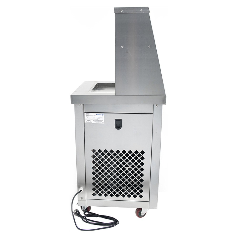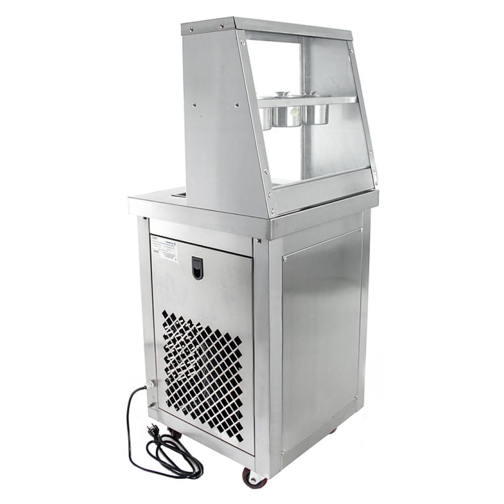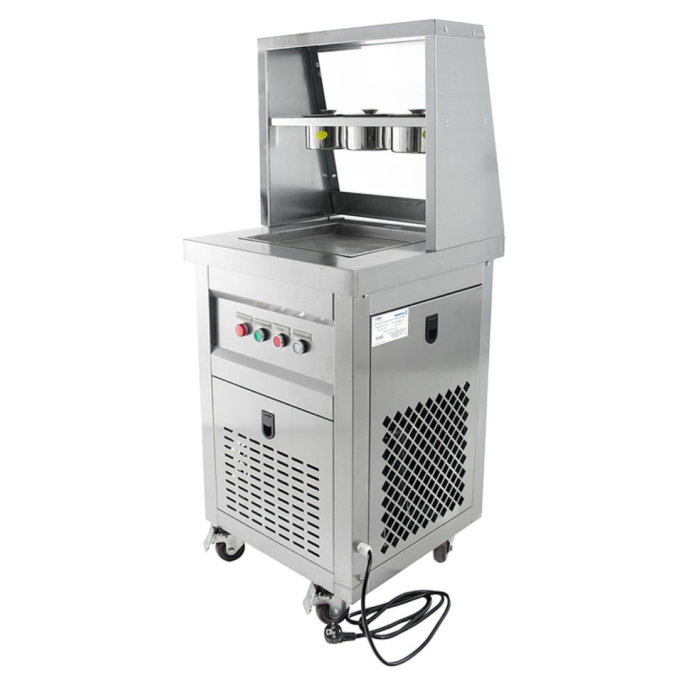Фризер для мороженого Foodatlas KCB-1F используется на предприятиях общественного питания и торговли для приготовления жареного мороженого в роллах. Модель оснащена механическим управлением, 3 цилиндрическими контейнерами, квадратной охлаждаемой поверхностью для "жарки" десерта при минусовой температуре и 4 колесами, 2 из которых снабжены тормозом. Корпус выполнен из нержавеющей стали 430, сковорода и контейнеры - из нержавеющей стали 304, радиатор - из алюминия.