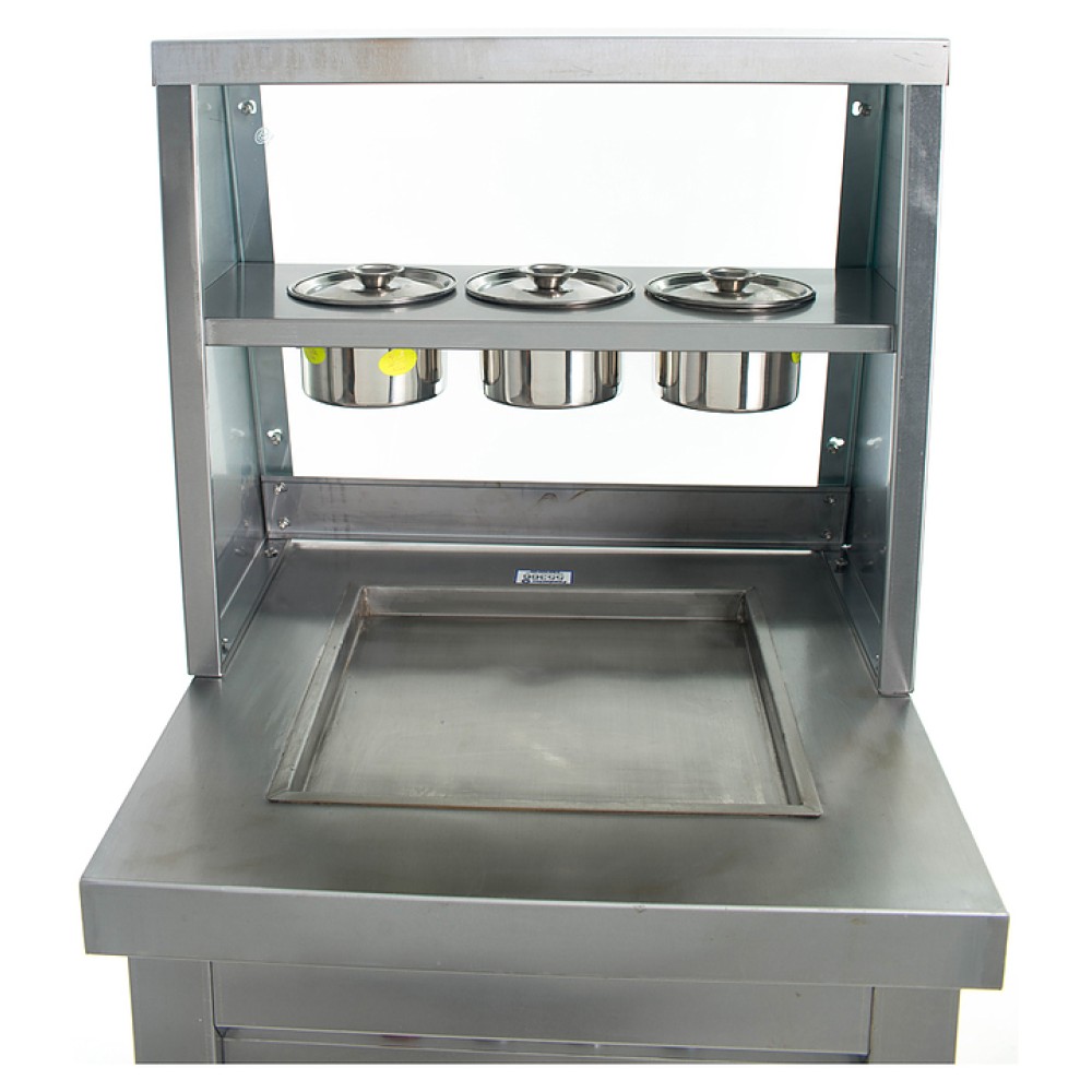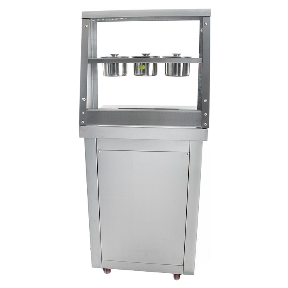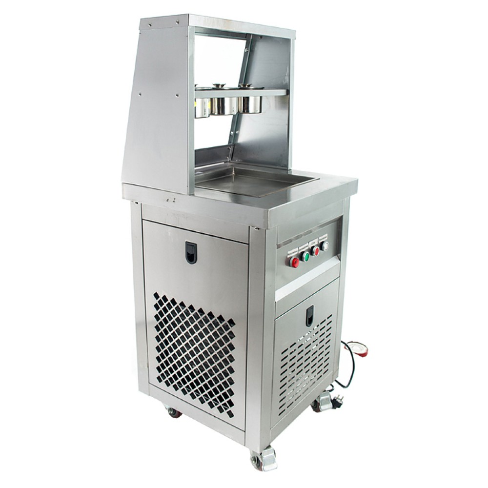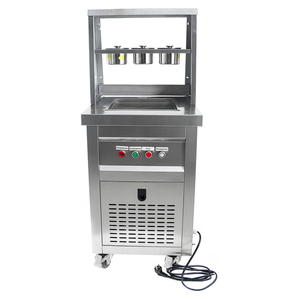 Фризер для мороженого Foodatlas KCB-1F используется на предприятиях общественного питания и торговли для приготовления жареного мороженого в роллах. Модель оснащена механическим управлением, 3 цилиндрическими контейнерами, квадратной охлаждаемой поверхностью для "жарки" десерта при минусовой температуре и 4 колесами, 2 из которых снабжены тормозом. Корпус выполнен из нержавеющей стали 430, сковорода и контейнеры - из нержавеющей стали 304, радиатор - из алюминия.