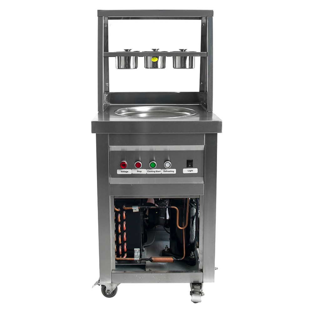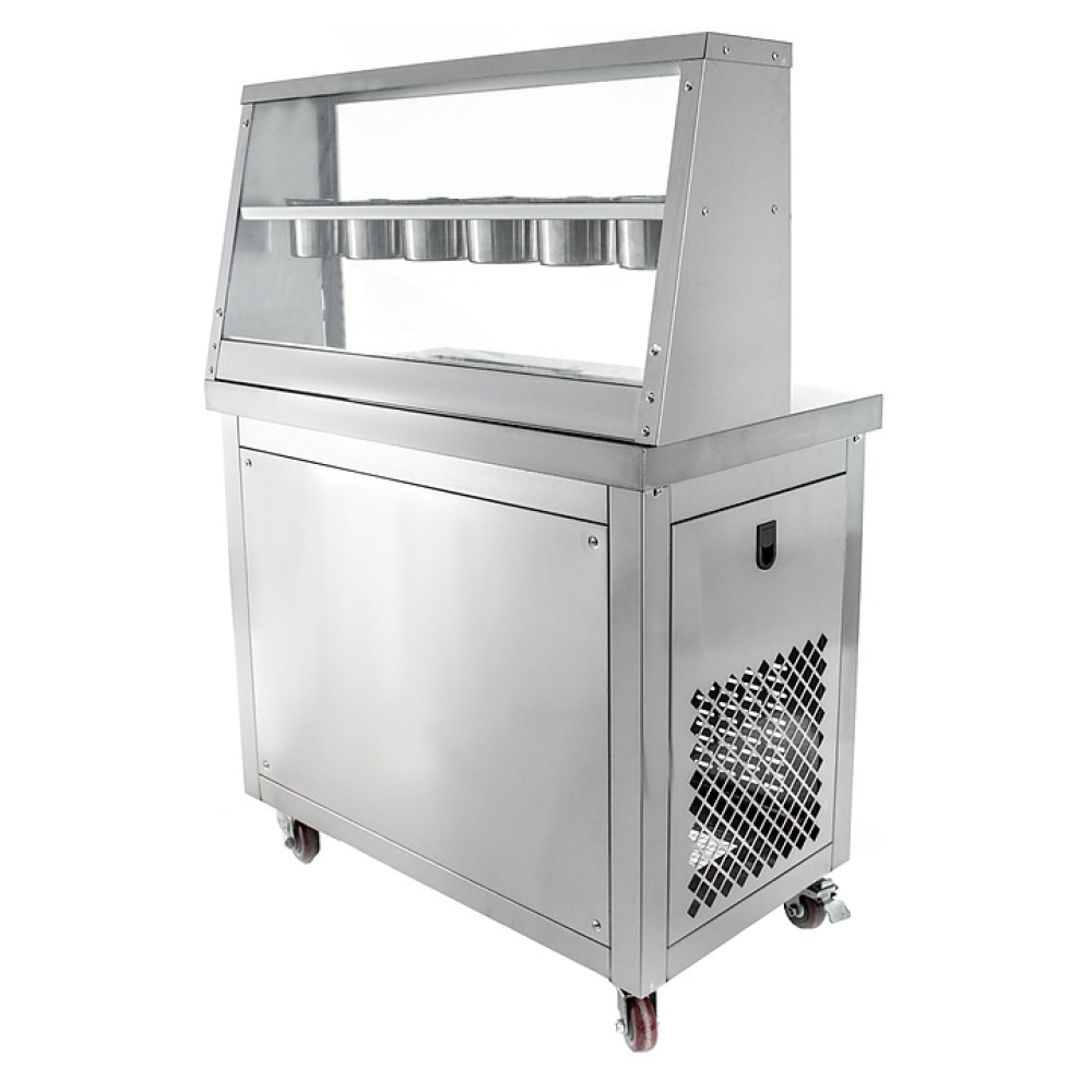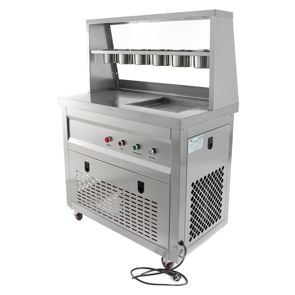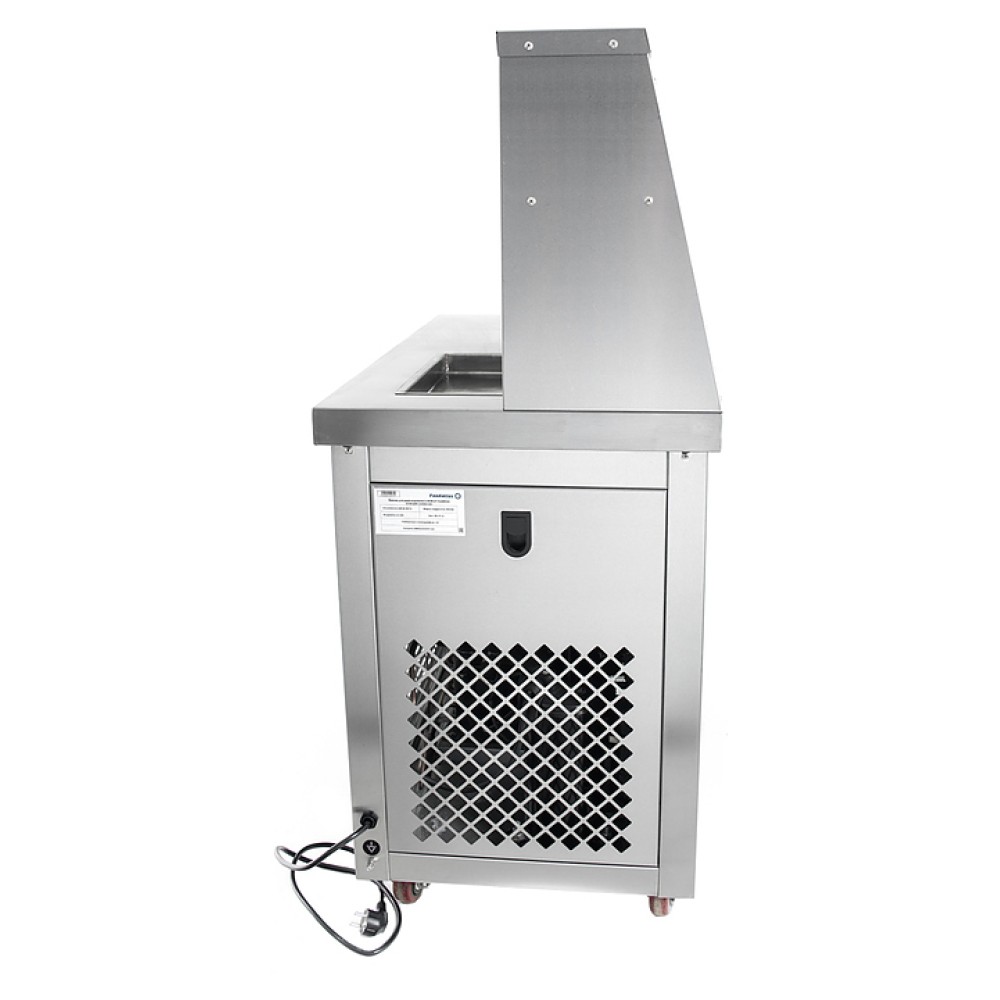 Фризер для мороженого Foodatlas KCB-1F используется на предприятиях общественного питания и торговли для приготовления жареного мороженого в роллах. Модель оснащена механическим управлением, столом для топпиногов, 3 цилиндрическими контейнерами, квадратной охлаждаемой поверхностью для "жарки" десерта при минусовой температуре и 4 колесами, 2 из которых снабжены тормозом. Корпус выполнен из нержавеющей стали 430, сковорода и контейнеры - из нержавеющей стали 304, радиатор - из алюминия.