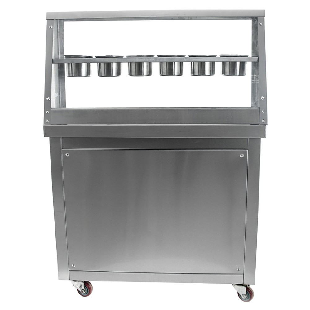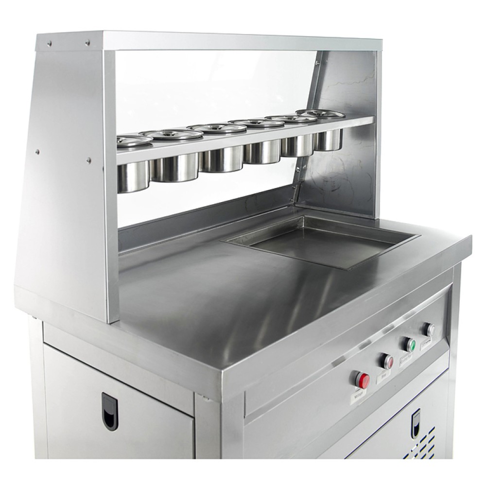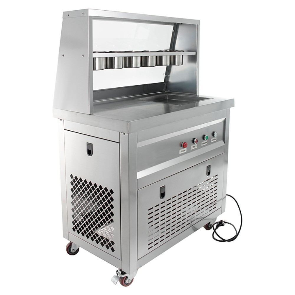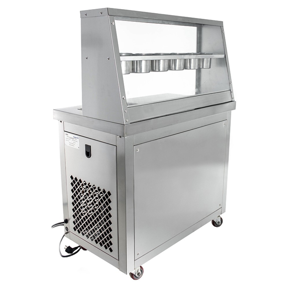Фризер для мороженого Foodatlas KCB-1F используется на предприятиях общественного питания и торговли для приготовления жареного мороженого в роллах. Модель оснащена механическим управлением, столом для топпиногов, 3 цилиндрическими контейнерами, квадратной охлаждаемой поверхностью для "жарки" десерта при минусовой температуре и 4 колесами, 2 из которых снабжены тормозом. Корпус выполнен из нержавеющей стали 430, сковорода и контейнеры - из нержавеющей стали 304, радиатор - из алюминия.