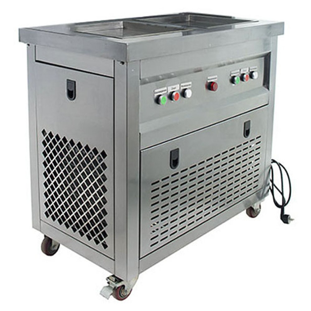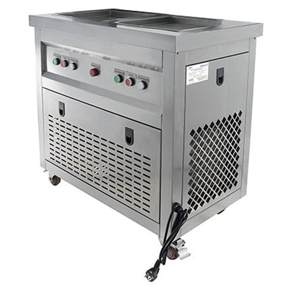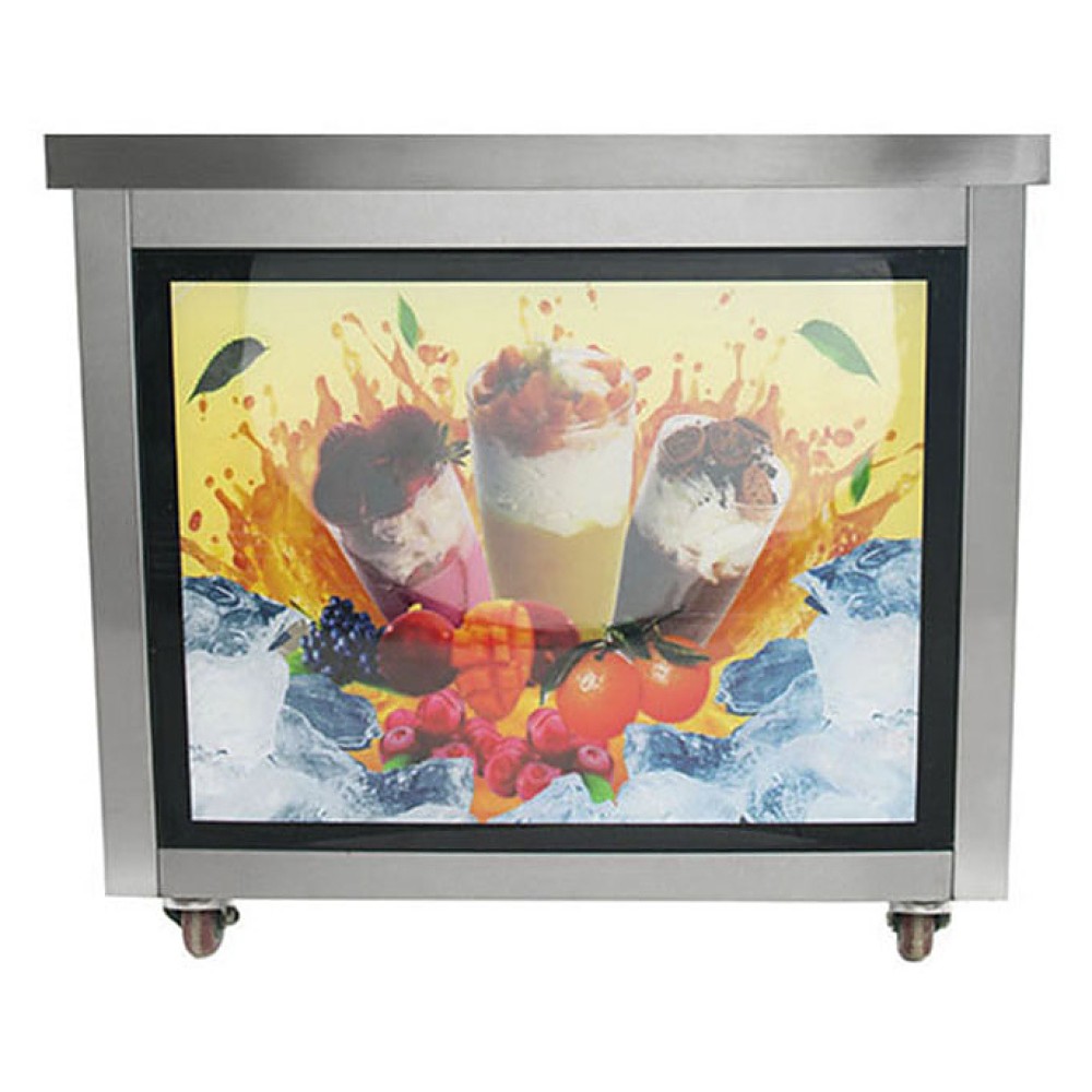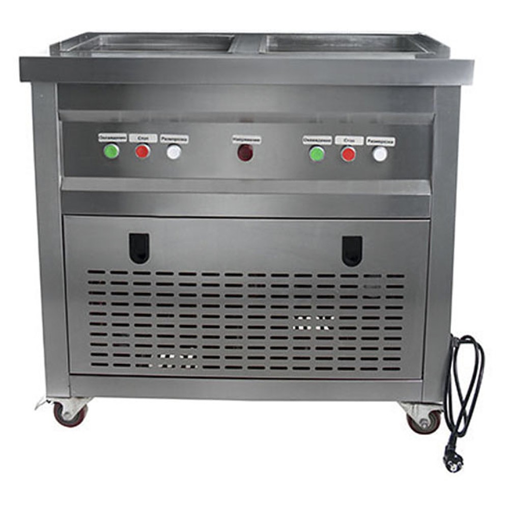 Фризер для мороженого Foodatlas KCB-2F используется на предприятиях общественного питания и торговли для приготовления жареного мороженого в роллах. Модель оснащена механическим управлением, световым коробом, 2 квадратными охлаждаемыми поверхностями для "жарки" десерта при минусовой температуре и 4 колесами, 2 из которых снабжены тормозом. Корпус выполнен из нержавеющей стали 430, сковорода и контейнеры - из нержавеющей стали 304, радиатор - из алюминия, каркас светового короба - из оргстекла, полотно светового короба - из ПВХ.
