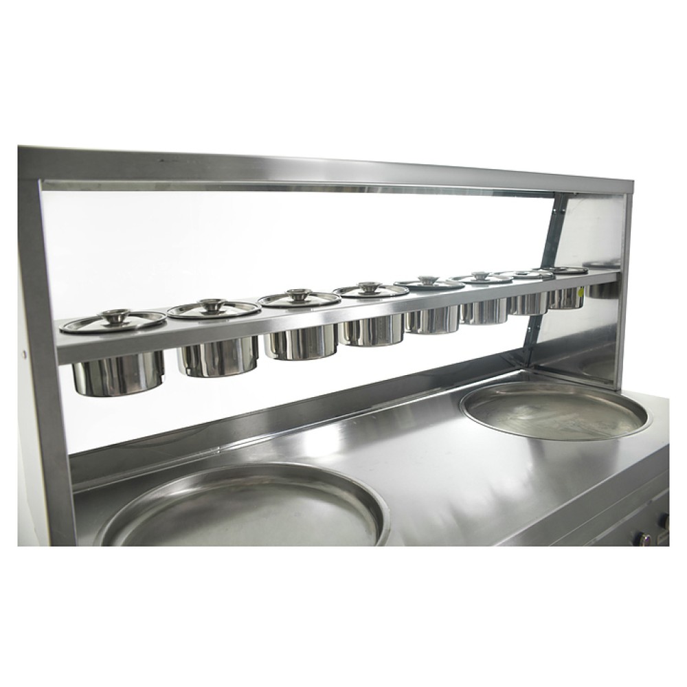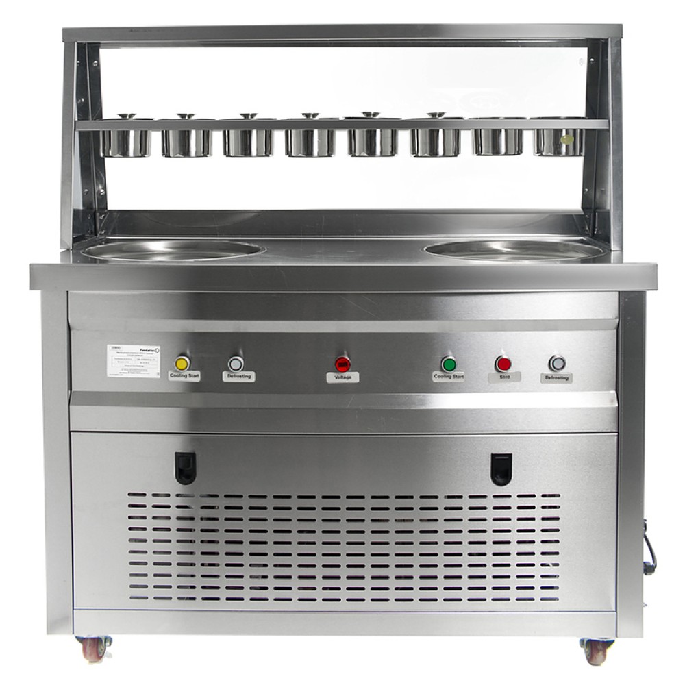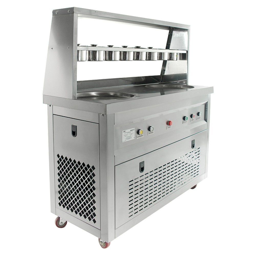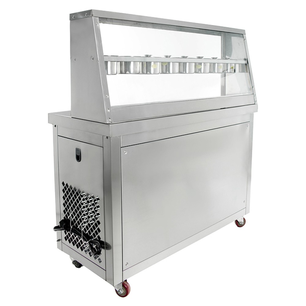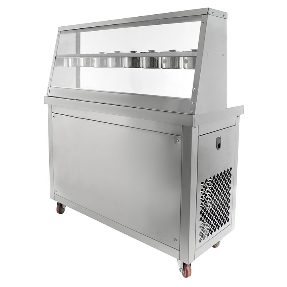 Фризер для мороженого Foodatlas KCB-2Y используется на предприятиях общественного питания и торговли для приготовления жареного мороженого в роллах. Модель оснащена механическим управлением, столом для топпингов, 6 квадратными контейнерами, 2 круглыми охлаждаемыми поверхностями для "жарки" десерта при минусовой температуре и 4 колесами, 2 из которых снабжены тормозом. Корпус выполнен из нержавеющей стали 430, сковорода и контейнеры - из нержавеющей стали 304, радиатор - из алюминия, каркас светового короба - из оргстекла, полотно светового короба - из ПВХ.