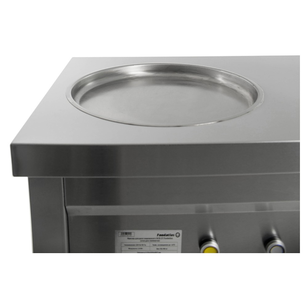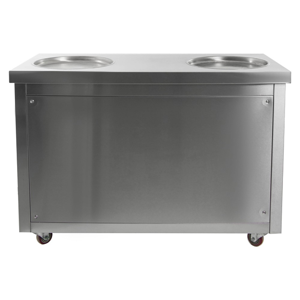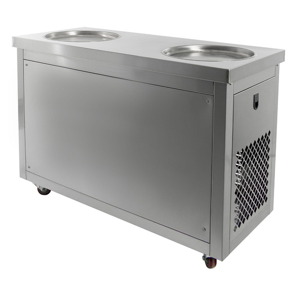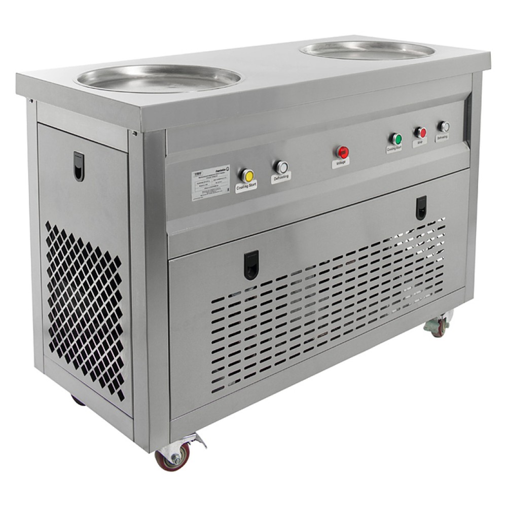Фризер для мороженого Foodatlas KCB-2Y используется на предприятиях общественного питания и торговли для приготовления жареного мороженого в роллах. Модель оснащена механическим управлением, столом для топпингов, 2 круглыми охлаждаемыми поверхностями для "жарки" десерта при минусовой температуре и 4 колесами, 2 из которых снабжены тормозом. Корпус выполнен из нержавеющей стали 430, сковорода и контейнеры - из нержавеющей стали 304, радиатор - из алюминия.