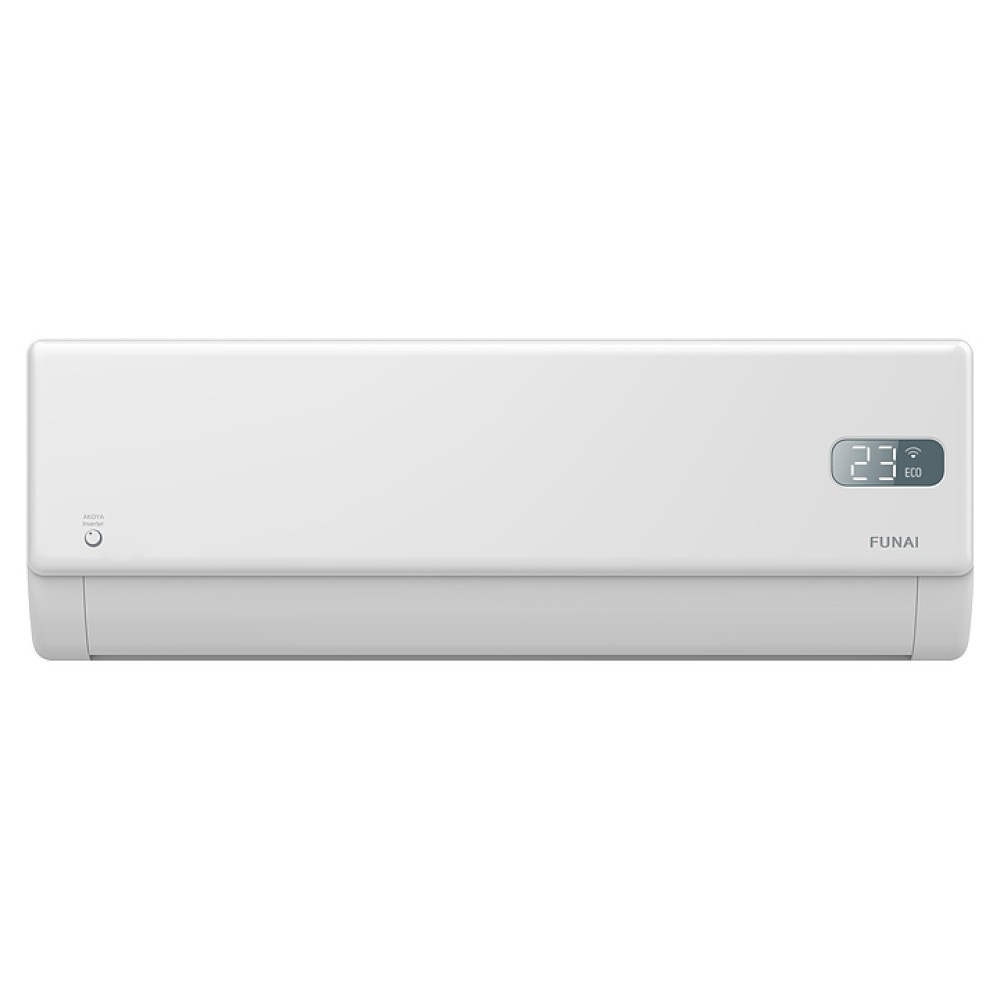 Настенная сплит-система FUNAI RAC-I-AK55HP.D01 серии AKOYA Inverter используется для создания максимально кофмортных условий микроклимата в жилых, офисных и коммерческих помещениях. Модель состоит из внутреннего блока RAC-I-AK55HP.D01/S и наружного блока RAC-I-AK55HP.D01/U. Наружный блок оснащен теплообменником, 3-лопастным вентилятором, защитными вентиляционной решеткой и крышкой для сервисных вентилей, внутренний блок – воздухозаборной решеткой, откидной лицевой панелью, подвижными горизонтальными и вертикальными жалюзи, электронным блоком управления и светодиодным дисплеем, пульт – информативным жидкокристаллическим дисплеем с подсветкой и кнопочной клавиатурой. Облицовка внутреннего блока выполнена из пластика с поверхностью белого цвета, корпус пульта – из ударопрочного черного пластика.
