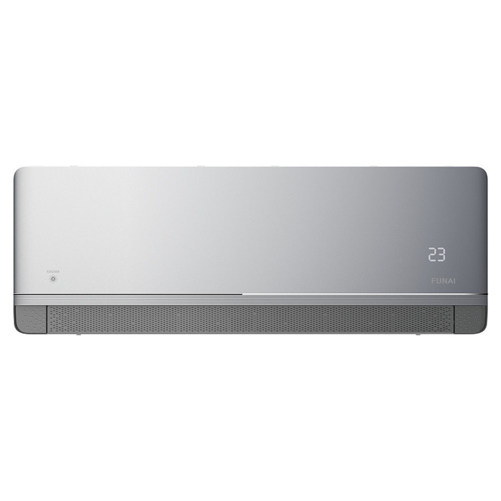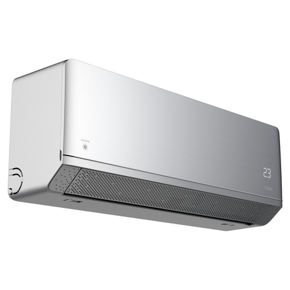 Настенная сплит-система FUNAI RAC-I-KM35HP.D01 серии KAGAMI Inverter используется для создания максимально кофмортных условий микроклимата в жилых, офисных и коммерческих помещениях. Модель состоит из внутреннего блока RAC-I-KM35HP.D01/S и наружного блока RAC-I-KM35HP.D01/U. Наружный блок оснащен теплообменником, 3-лопастным вентилятором, защитными вентиляционной решеткой и крышкой для сервисных вентилей, внутренний блок – воздухозаборной решеткой, откидной лицевой панелью, подвижными горизонтальными и вертикальными жалюзи, электронным блоком управления и светодиодным дисплеем, пульт – информативным жидкокристаллическим дисплеем с подсветкой и кнопочной клавиатурой. Облицовка внутреннего блока выполнена из пластика с поверхностью цвета серебро, корпус пульта – из ударопрочного белого пластика.
