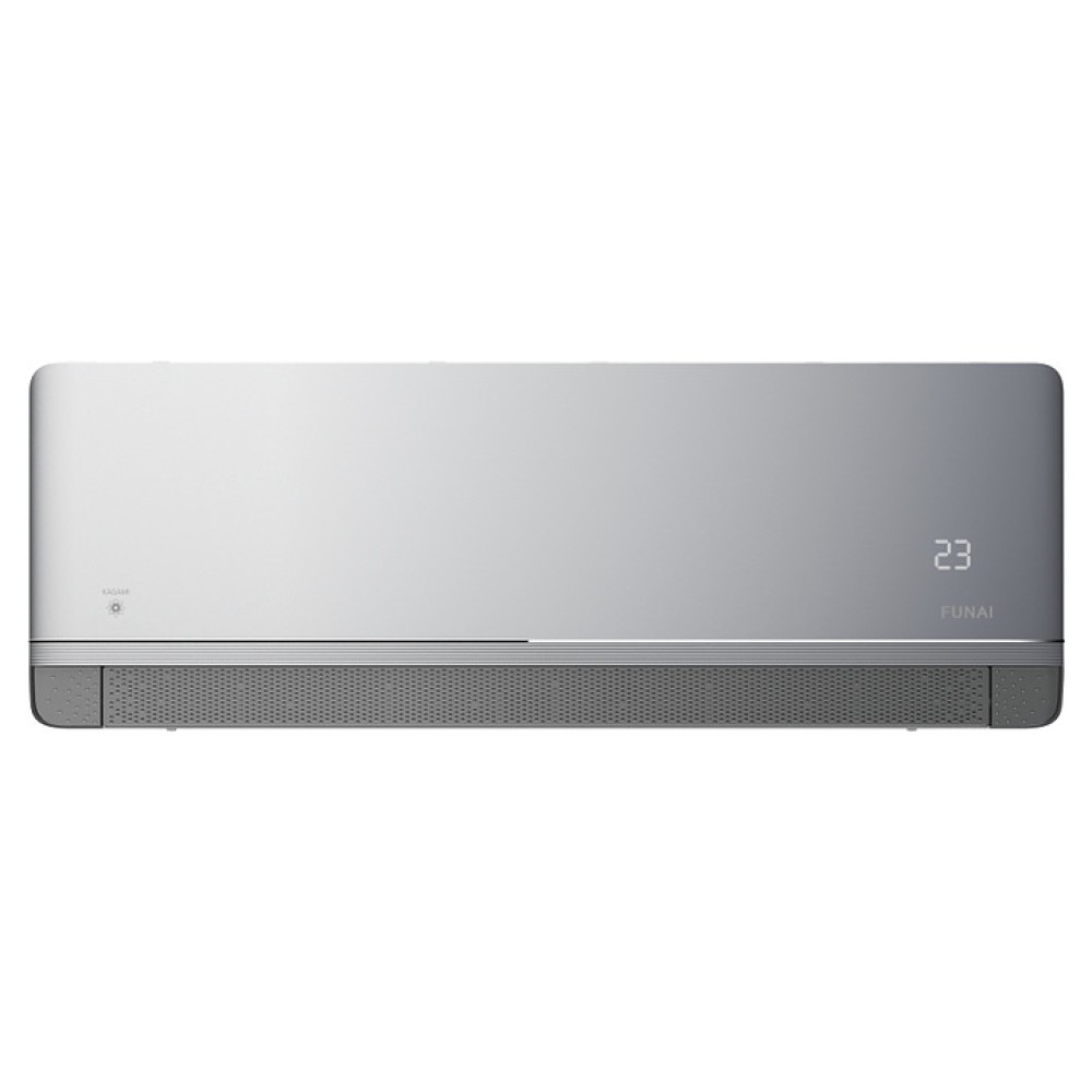 Настенная сплит-система FUNAI RAC-KM25HP.D01 серии KAGAMI Inverter используется для создания максимально кофмортных условий микроклимата в жилых, офисных и коммерческих помещениях. Модель состоит из внутреннего блока RAC-KM25HP.D01/S и наружного блока RAC-KM25HP.D01/U. Наружный блок оснащен теплообменником, 3-лопастным вентилятором, защитными вентиляционной решеткой и крышкой для сервисных вентилей, внутренний блок – воздухозаборной решеткой, откидной лицевой панелью, подвижными горизонтальными и вертикальными жалюзи, электронным блоком управления и светодиодным дисплеем, пульт – информативным жидкокристаллическим дисплеем с подсветкой и кнопочной клавиатурой. Облицовка внутреннего блока выполнена из пластика с поверхностью цвета серебро, корпус пульта – из ударопрочного черного пластика.