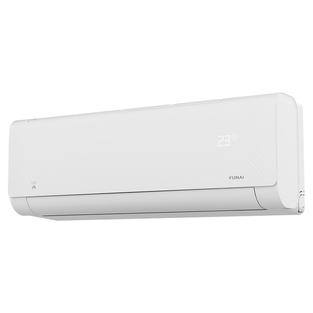 Настенная сплит-система FUNAI SHOGUN Inverter RAC-I-SG25HP.D01 используется для создания максимально кофмортных условий микроклимата в жилых, офисных и коммерческих помещениях. Модель состоит из внутреннего блока RAC-I-SG25HP.D01/S и наружного блока RAC-I-SG25HP.D01/U. Наружный блок оснащен защитными вентиляционной решеткой и крышкой для вентилей, внутренний блок – воздухозаборной решеткой, откидной фронтальной крышкой, подвижной горизонтальной заслонкой и электронным блоком управления, пульт – информативным жидкокристаллическим дисплеем и кнопочной клавиатурой. Облицовка внутреннего блока выполнена из пластика с поверхностью белого цвета, корпус пульта – из ударопрочного черного пластика, теплообменник наружного блока с антикоррозийным покрытием Blue Fin.