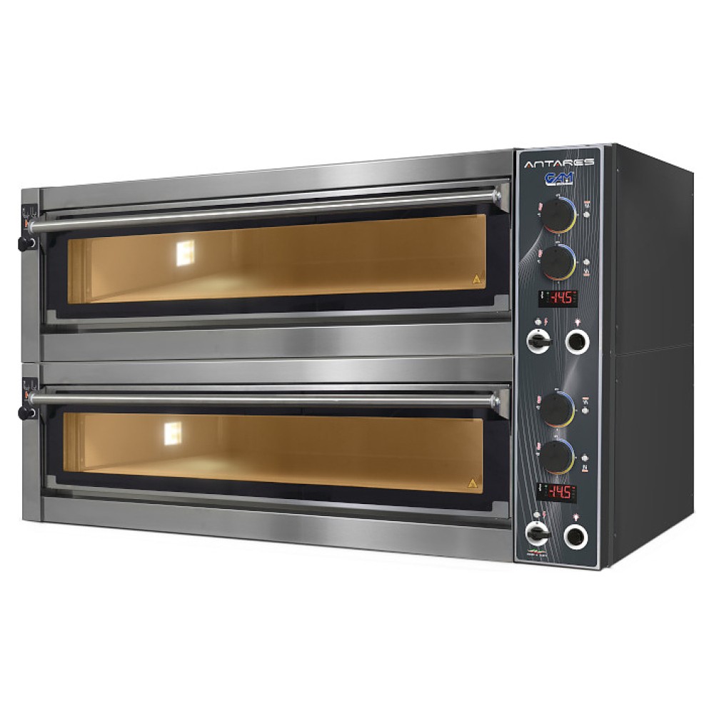 Печь для пиццы GAM Antares M44 используется на предприятиях общественного питания, в кондитерских, пекарнях, супер- и гипермаркетах с собственной кухней для выпечки пиццы и хлебобулочных изделий, требующих высокой температуры приготовления. Фасад выполнен из алюминированного листового металла, боковины и крыша - из окрашенного листового металла, дверцы - из нержавеющей стали, окна - из двойногостекла, устойчивого к высоким температурам, под - из шамотного камня.
