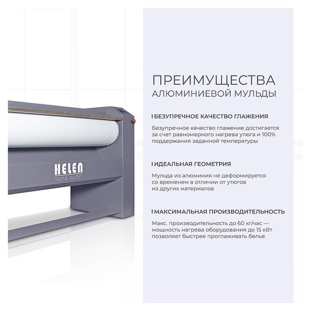 Гладильный каток HELEN Н160.30A используется в прачечных, гостиницах, салонах красоты, больницах и детских учреждениях для глажения различного белья с относительной влажностью не более 25%. Модель оснащена и арамидным чехлом и вытяжным вентилятором для отвода пара. Мульда выполнена из алюминия, обмотка вала - из металлической шерсти.