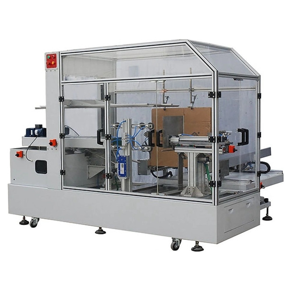 Сборщик коробов Hualian CXJ-6040C используется на предприятиях различных отраслей для автоматического формирования упаковочных картонных коробов из заготовок. Принцип работы: предварительно загруженная в магазин картонная вырубка захватывается специальным механизмом, затем происходит формирование прямоугольника корпуса, складывание нижних створок и герметизация дна клейкой лентой. Модель оснащена защитным кожухом с распашными дверьми и электромеханической панелью управления.