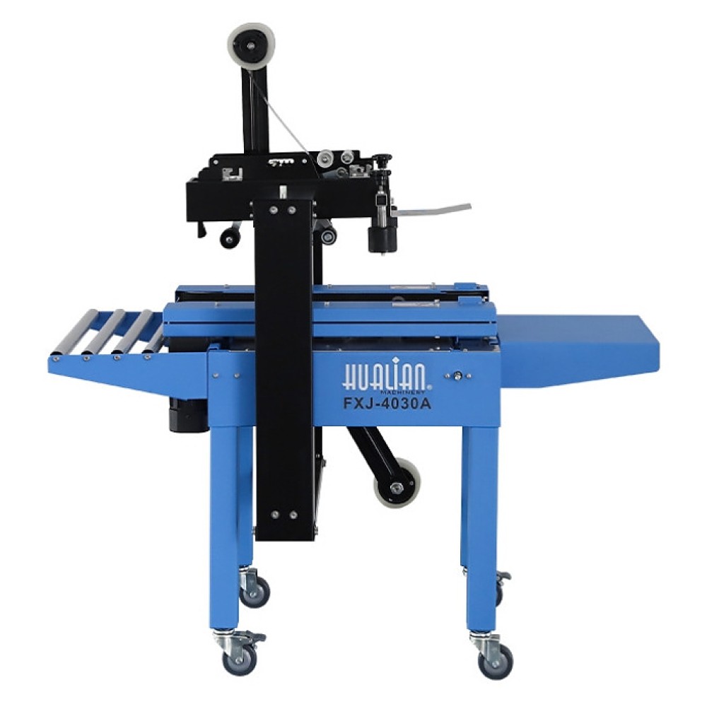 Полуавтоматический заклейщик Hualian FXJ-4030A используется на предприятиях различных отраслей для герметизации упаковочных картонных коробов клейкой лентой. Модель оснащена рабочим столом с сегментной роликовой поверхностью, 2 вертикальными направляющими с ленточными конвейерами снизу, 2 центрирующими роликами сверху, рулонодержателем для клейкой ленты и панелью управления на боковой стенке.