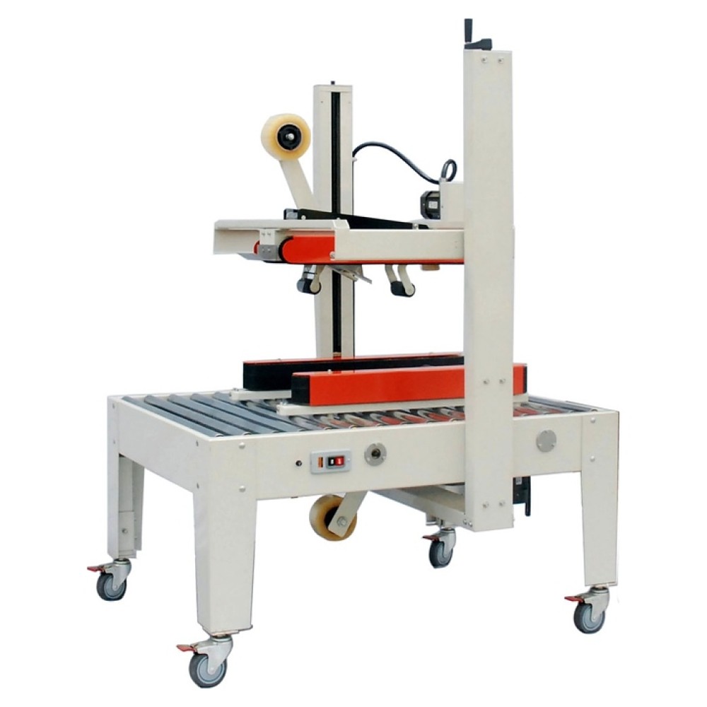 Полуавтоматический заклейщик Hualian FXJ-8070B используется на предприятиях различных отраслей для герметизации упаковочных картонных коробов клейкой лентой. Модель оснащена рабочим столом с сегментной роликовой поверхностью, 2 вертикальными направляющими с ленточными конвейерами снизу, прижимной направляющей с ленточным конвейером сверху, рулонодержателем для клейкой ленты и панелью управления на боковой стенке.