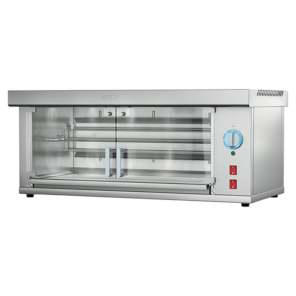 Гриль для кур ATESY Командор-2/1 М используется на предприятиях общественного питания и торговли для обжаривания целых тушек кур на вертеле (шампуре). Модель оснащена 1 съемным шампуром, рассчитанным на 5 кур. Корпус и все внутренние элементы, контактирующие с продуктами, выполнены из пищевой нержавеющей стали AISI 430, двери - из закаленного термостойкого стекла.