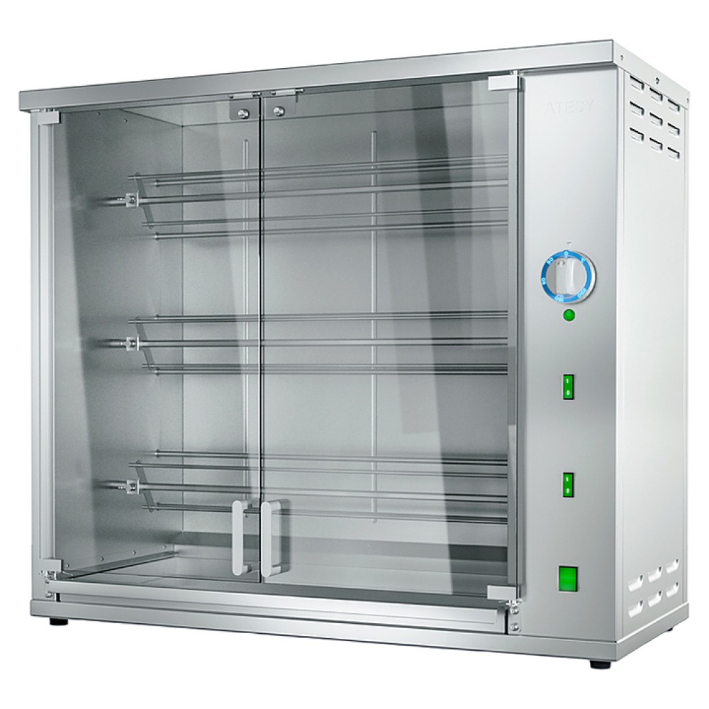 Гриль для кур ATESY Командор-2/3-Э используется на предприятиях общественного питания и торговли для обжаривания целых тушек кур на вертелах (шампурах). Модель оснащена 3 съемными шампурами, каждый из которых рассчитан на 5 кур. Корпус и все внутренние элементы, контактирующие с продуктами, выполнены из пищевой нержавеющей стали AISI 430, двери - из закаленного термостойкого стекла.