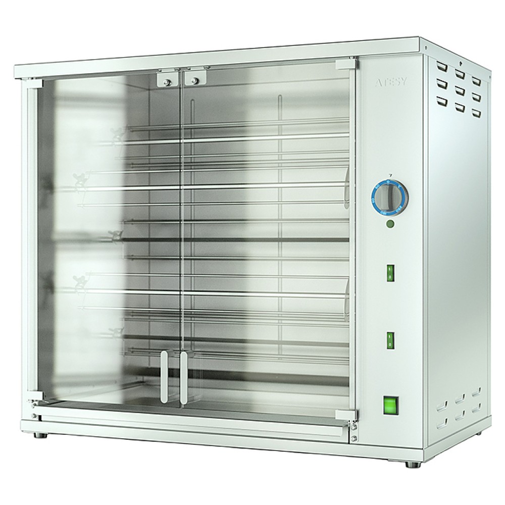 Гриль для кур ATESY Командор-2/5-Э используется на предприятиях общественного питания и торговли для обжаривания целых тушек кур на вертелах (шампурах). Модель оснащена 2 рядами шампуров: 3 дальних шампура предназначены для жарки кур, 2 ближних - для поддержания готовых кур в горячем состоянии. Корпус и все внутренние элементы, контактирующие с продуктами, выполнены из пищевой нержавеющей стали AISI 430, двери - из закаленного термостойкого стекла.