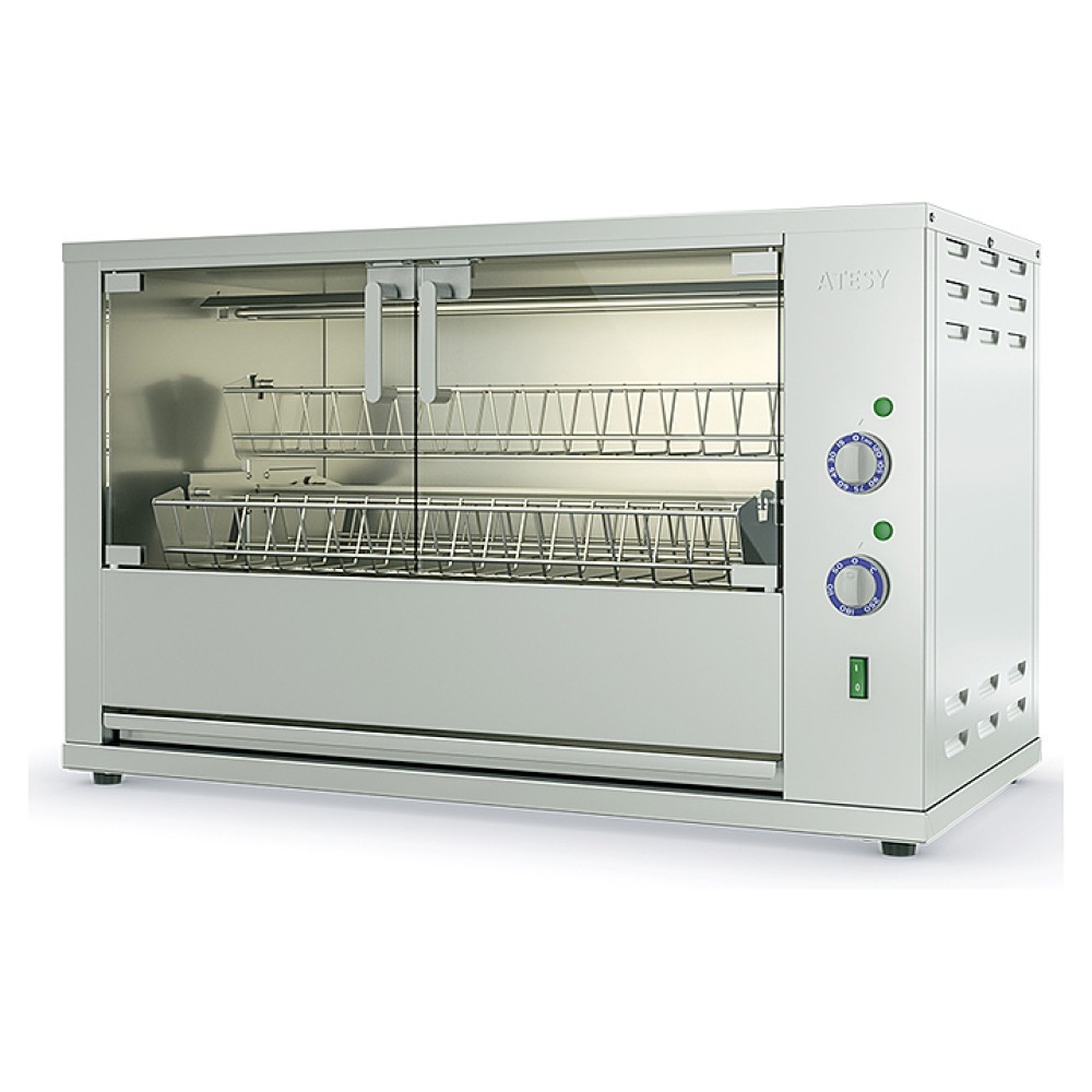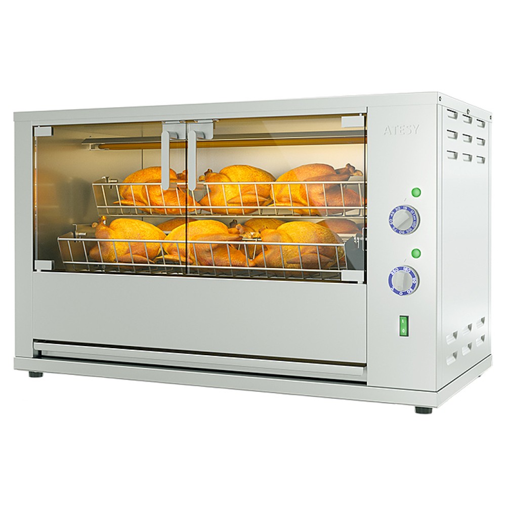 Гриль для кур ATESY Командор-5Э-Т-380 используется на предприятиях общественного питания и торговли для жарки тушек кур, цыплят, куриных окорочков, грудок и других продуктов питания. Модель оснащена 4 легкосъемными садками (люльками), вращающимися вокруг центральной оси внутри рабочей камеры. Корпус выполнен из пищевой нержавеющей стали AISI 430, садки для кур - из нержавеющего прутка, двери - из закаленного термостойкого ударопрочного стекла.