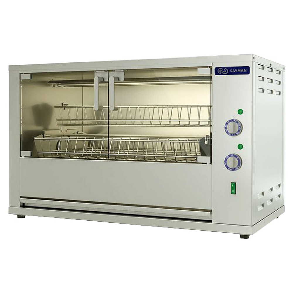 Гриль для кур KAYMAN ГЭ-4С12-Т A используется на предприятиях общественного питания и торговли для жарки тушек кур, цыплят, куриных окорочков, грудок и других продуктов питания. Модель оснащена 4 легкосъемными садками (люльками), вращающимися вокруг центральной оси внутри рабочей камеры, и ТЭНами, расположенными на передней, задней и верхней частях рабочей камеры. Корпус выполнен из пищевой нержавеющей стали AISI 430, садки для кур - из нержавеющего прутка, двери - из закаленного термостойкого стекла.