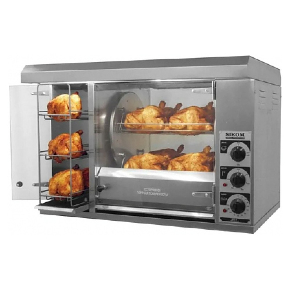 Гриль для кур Sikom МК-8.12В предназначен для приготовления кур-гриль в заведениях быстрого питания, супермаркетах и уличной торговли. Модель оснащена электромеханической панелью управления, таймером и встроенной боковой витриной.