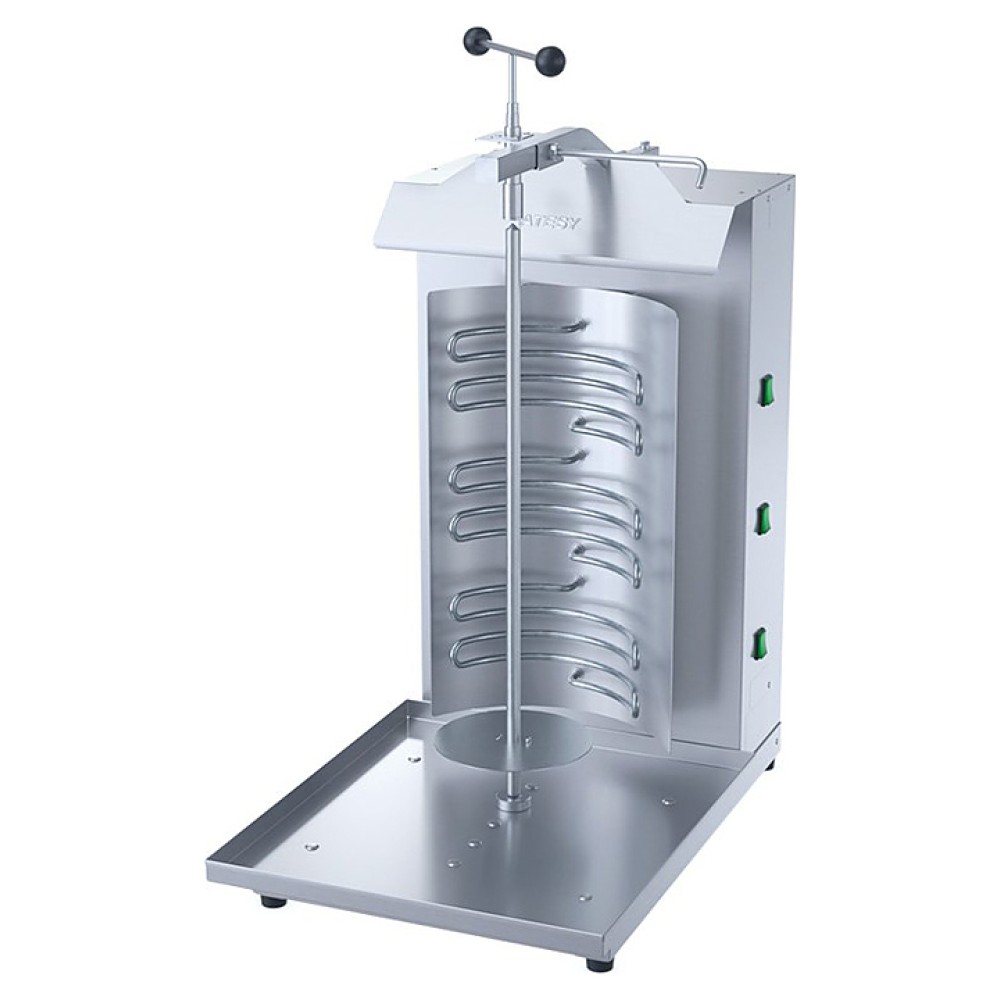 Электрический гриль ATESY Шаурма 3-Эл-05-Н используется на предприятиях общественного питания и торговли для приготовления мясной начинки популярного блюда шаурма (шаверма). Модель оснащена 3 трубчатыми электронагревателями (ТЭНами). Корпус выполнен из нержавеющей стали, все элементы, контактирующие с пищей - из материалов, разрешенных для контакта с пищевыми продуктами.