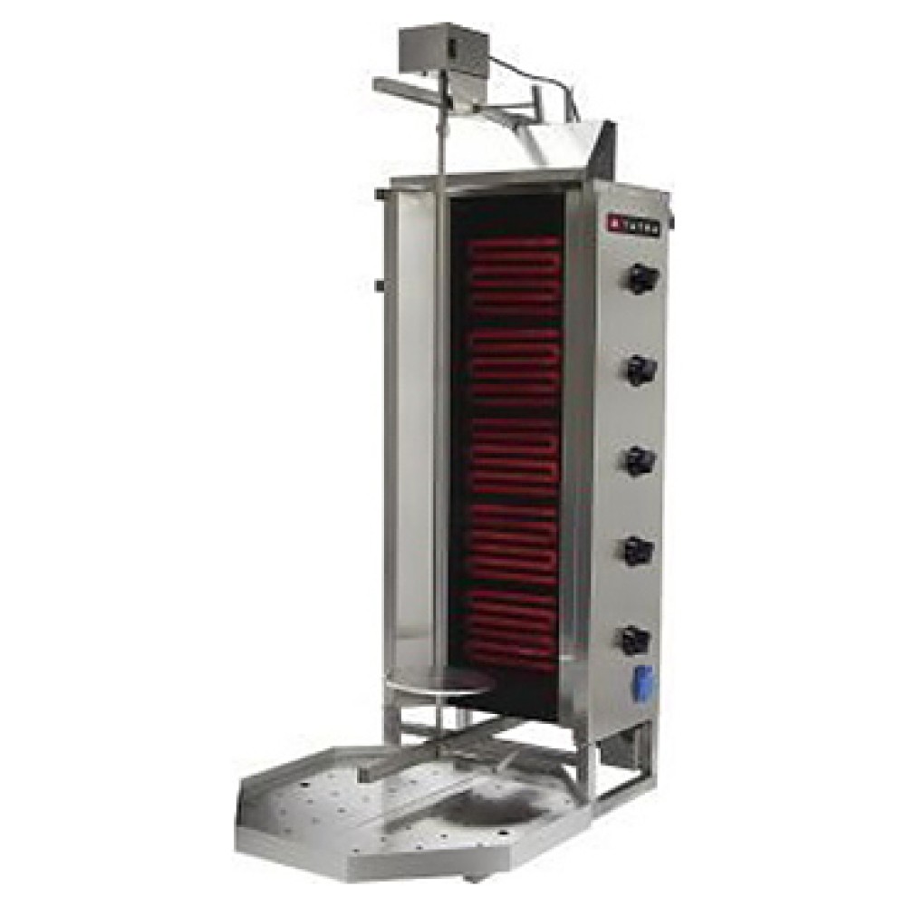 Гриль для шаурмы Tatra TDM E 5T M используется на предприятиях общественного питания и торговли для приготовления мясной начинки для шаурмы. Равномерное приготовление мяса происходит благодаря вращению заготовки вокруг своей оси около нагревательных элементов, по мере готовности прожаренный слой срезается электрическим или обычным ножом. Модель оснащена вертикально-ориентированным жарочным блоком с 5 трубчатыми нагревательными элементами и электромеханической панелью управления. Корпус выполнен из нержавеющей стали.