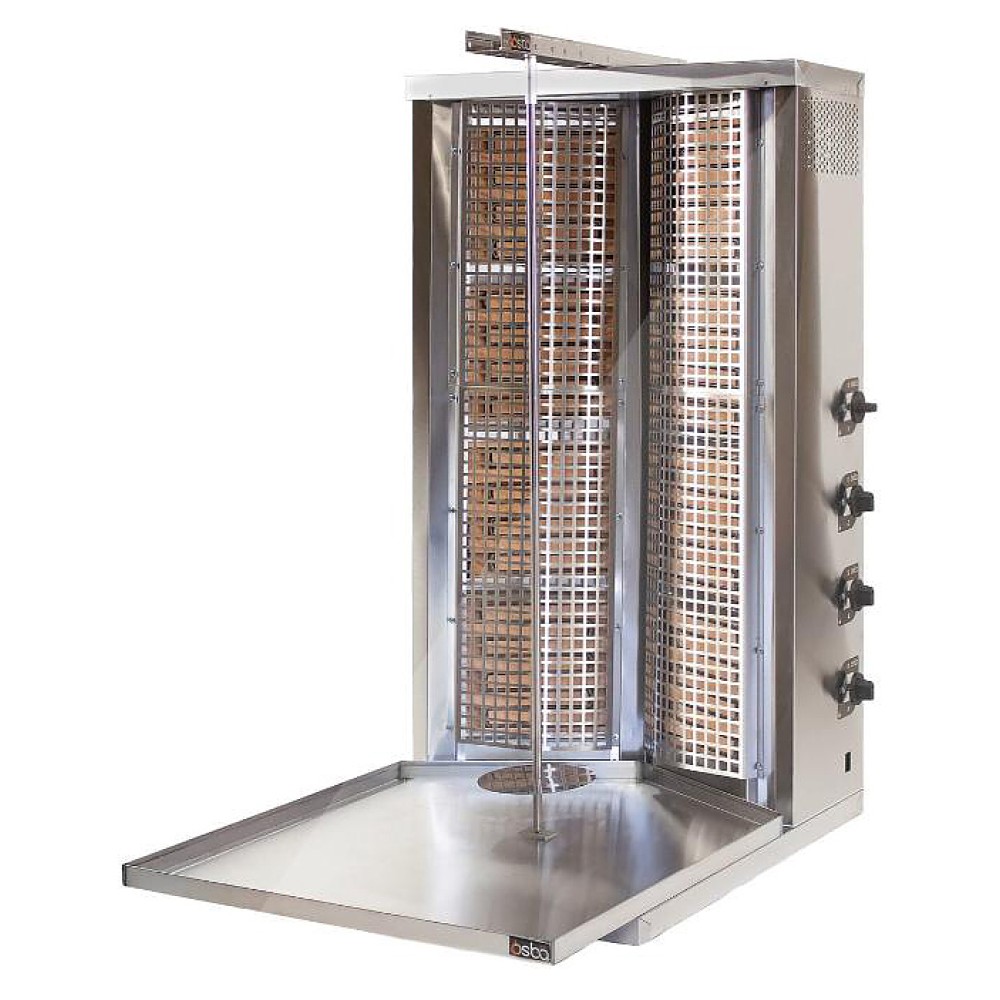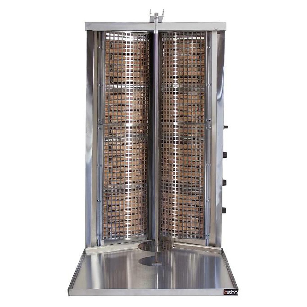 Гриль для шаурмы Osba 3.8K предназначен для обжарки большого количества различных видов мяса и птицы при приготовлении начинки для шаурмы, донера и других блюд на предприятиях общественного питания и торговли. Размещение на вертикальном вертеле и ручное управление вращением обеспечивают равномерное приготовление. Модель оснащена 8 зонами нагрева с 2 уровнями мощности. Решетка на нагревательных элементах гарантирует безопасность и чистоту во время приготовления. Перемещение вертела вперед и назад позволяет регулировать расстояние между мясом и нагревом при разном количестве заготовки. Корпус и решетка выполнены из нержавеющей стали, которая отличается прочностью и долговечностью.