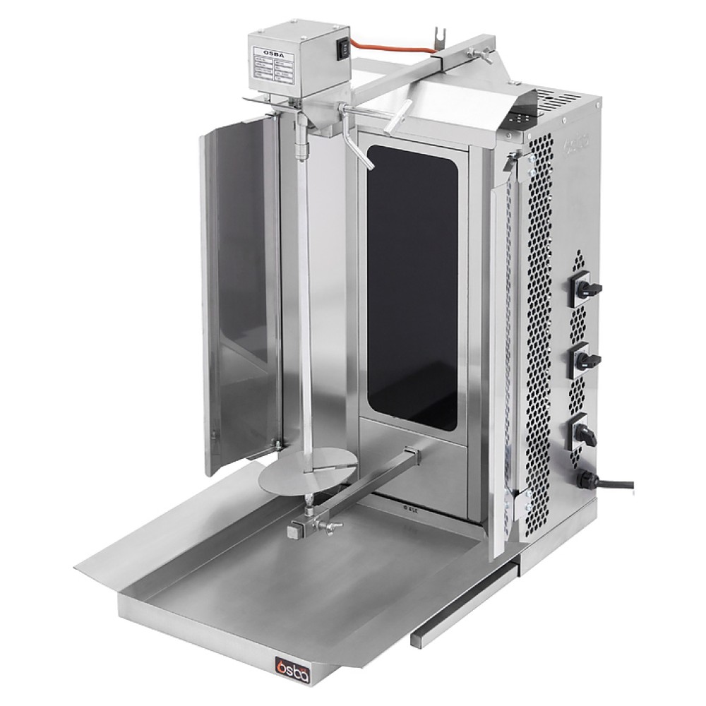 Гриль для шаурмы Osba MED-03E предназначен для обжарки большого количества различных видов мяса и птицы для приготовления начинки для шаурмы, донера и других блюд на предприятиях общественного питания и торговли. Модель оснащена 3 ТЭНами, верхним мотором и керамическим стеклом для защиты нагревательных элементов от попадания масла. Корпус выполнен из нержавеющей стали AISI 304.