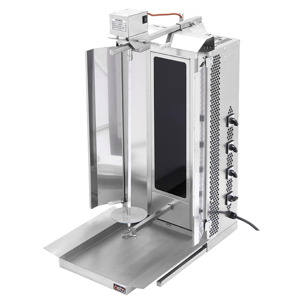 Гриль для шаурмы Osba MED-04E предназначен для обжарки большого количества различных видов мяса и птицы для приготовления начинки для шаурмы, донера и других блюд на предприятиях общественного питания и торговли. Модель оснащена 4 ТЭНами, верхним мотором и керамическим стеклом для защиты нагревательных элементов от попадания масла. Корпус выполнен из нержавеющей стали AISI 304.