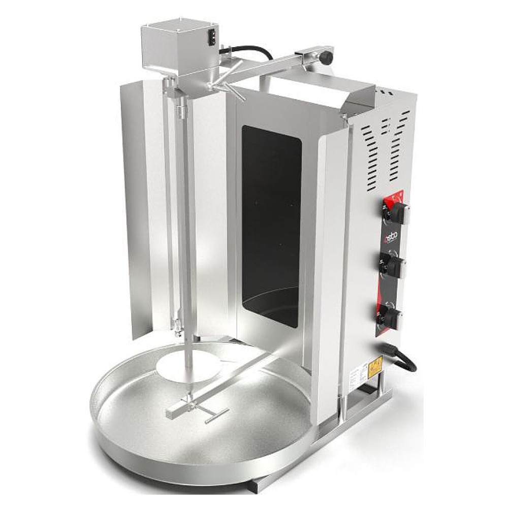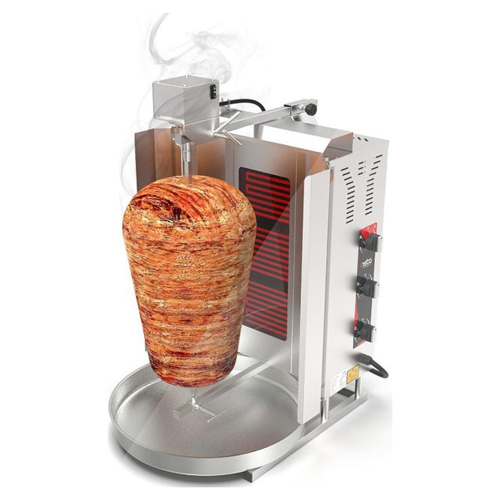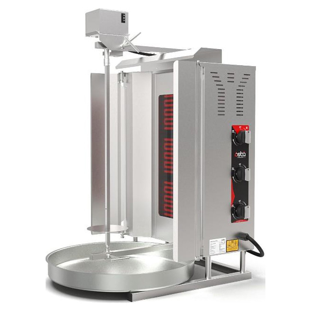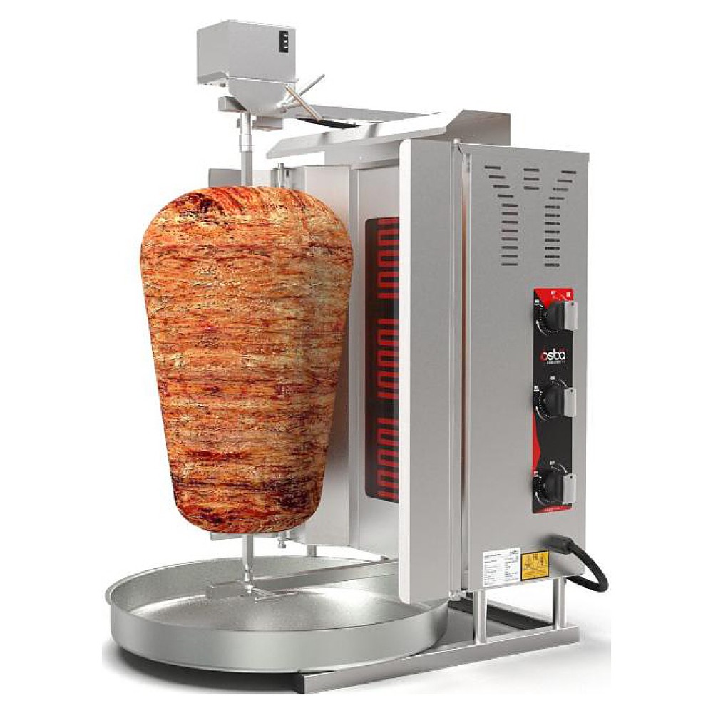 Электрический гриль Osba SD14 предназначен для обжарки большого количества различных видов мяса и птицы при приготовлении начинки для шаурмы, донера и других блюд на предприятиях общественного питания и торговли. Размещение на вертикальном вертеле и электрическое управление вращением обеспечивают равномерное приготовление. Модель оснащена защитным козырьком, 3 зонами нагрева, каждая из которых имеет индивидуальное управление с плавной регулировкой мощности. Покрытие на нагревательных элементах гарантирует легкую очистку. Перемещение вертела вперед и назад позволяет регулировать расстояние между мясом и нагревом при разном количестве заготовки. Корпус выполнен из нержавеющей стали, которая отличается прочностью и долговечностью, защита нагревателей - из жаростойкой стеклокерамики.