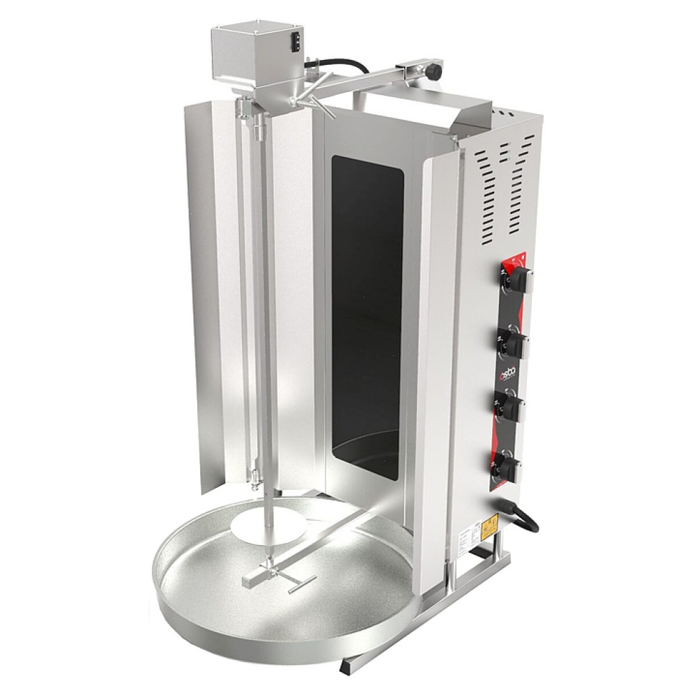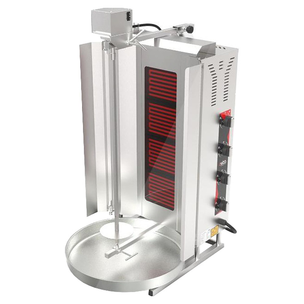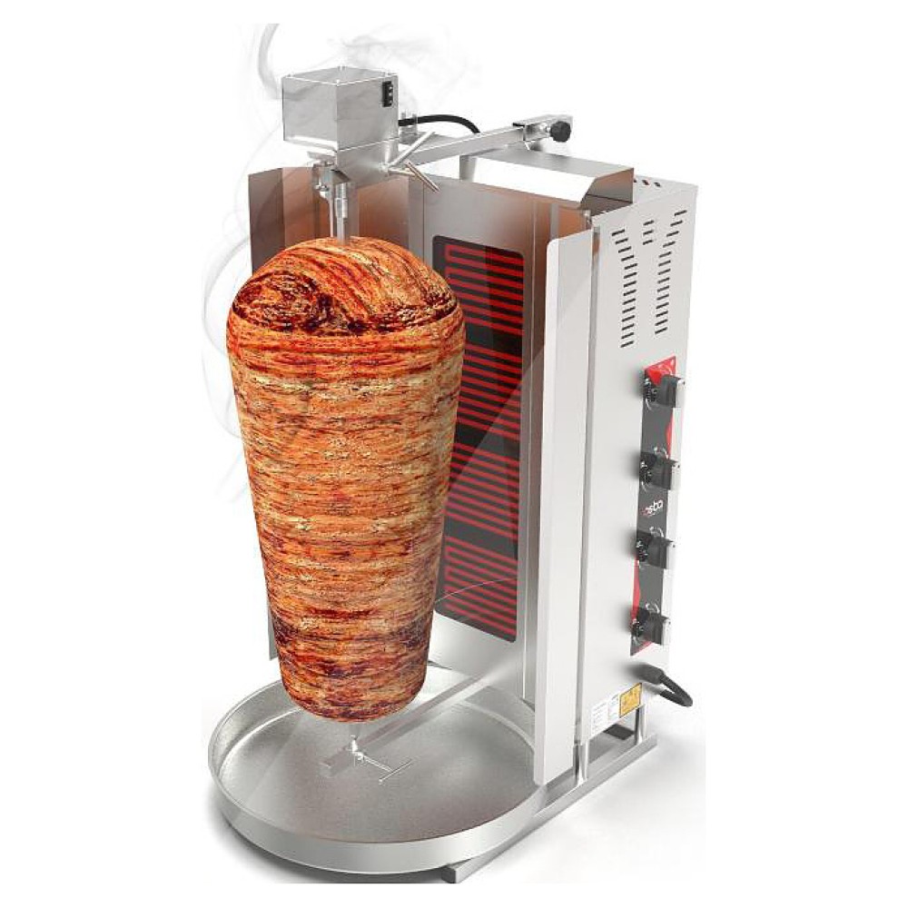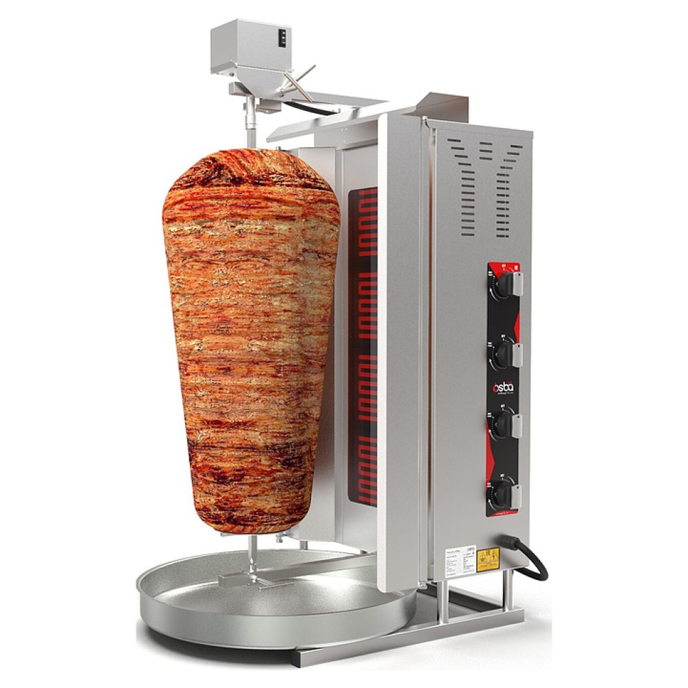 Электрический гриль Osba SD17 предназначен для обжарки большого количества различных видов мяса и птицы при приготовлении начинки для шаурмы, донера и других блюд на предприятиях общественного питания и торговли. Размещение на вертикальном вертеле и электрическое управление вращением обеспечивают равномерное приготовление. Модель оснащена защитным козырьком, 4 зонами нагрева, каждая из которых имеет индивидуальное управление с плавной регулировкой мощности. Покрытие на нагревательных элементах гарантирует легкую очистку. Перемещение вертела вперед и назад позволяет регулировать расстояние между мясом и нагревом при разном количестве заготовки. Корпус выполнен из пищевой нержавеющей стали, которая отличается прочностью и долговечностью, защита нагревателей - из жаростойкой стеклокерамики.