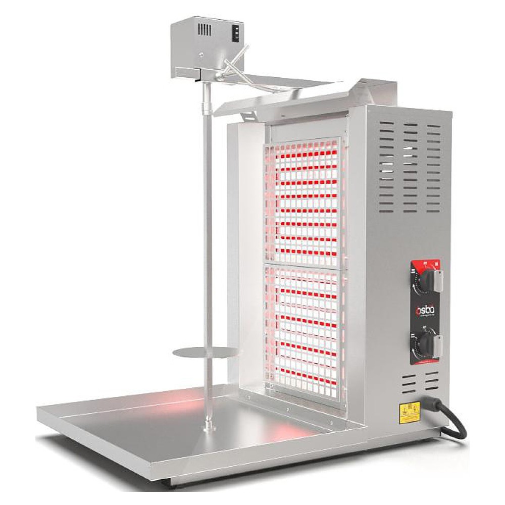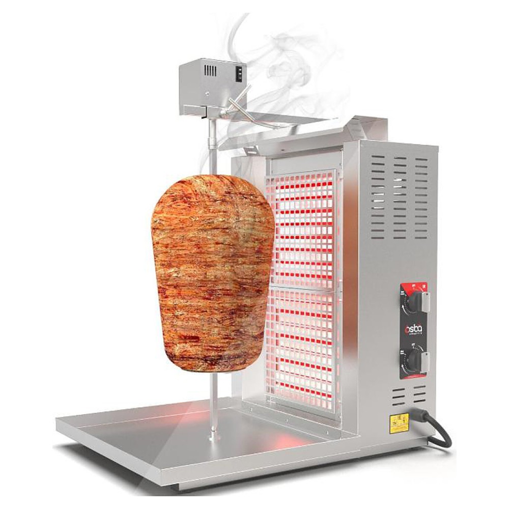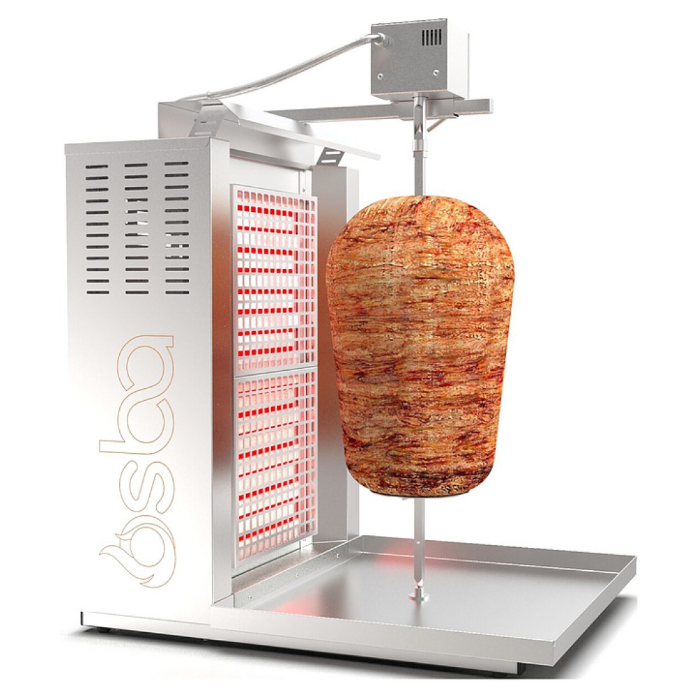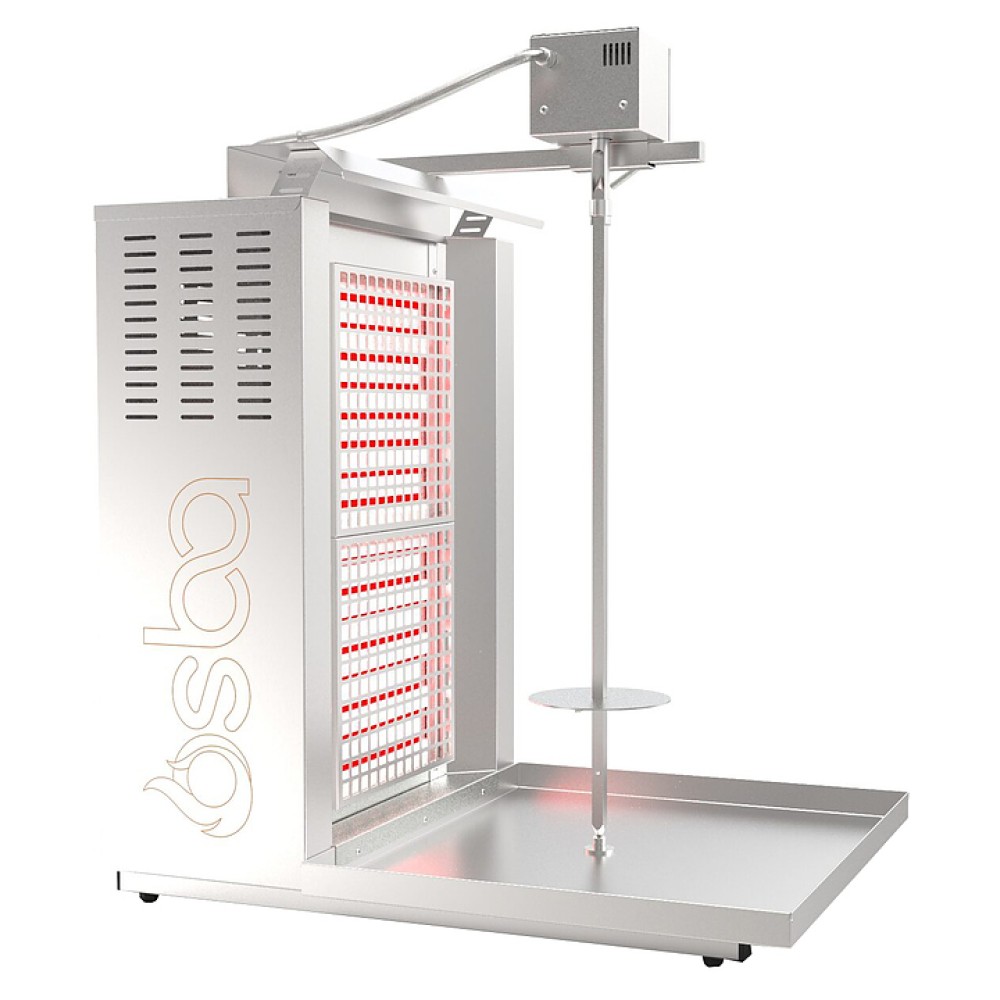 Электрический гриль Osba SH2-LE предназначен для обжарки большого количества различных видов мяса и птицы при приготовлении начинки для шаурмы, донера и других блюд на предприятиях общественного питания и торговли. Размещение на вертикальном вертеле и электрическое управление вращением обеспечивают равномерное приготовление. Модель оснащена защитным козырьком и 2 зонами нагрева, каждая из которых имеет индивидуальное управление с плавной регулировкой мощности. Перемещение вертела вперед и назад позволяет регулировать расстояние между мясом и нагревом при разном количестве заготовки. Корпус и решетка нагревателей выполнены из нержавеющей стали, которая отличается прочностью и долговечностью.