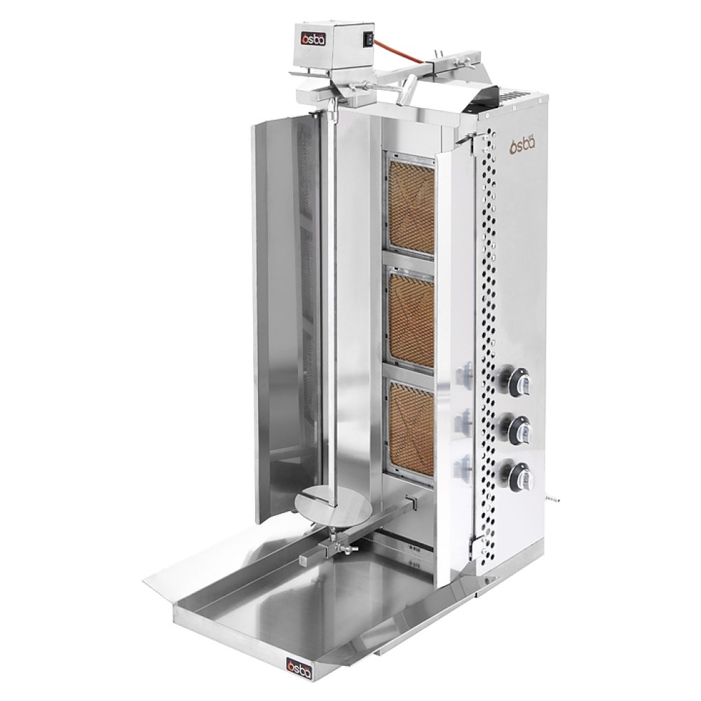 Гриль для шаурмы Osba UST-03G предназначен для обжарки большого количества различных видов мяса и птицы для приготовления начинки для шаурмы, донера и других блюд на предприятиях общественного питания и торговли. Модель оснащена 3 инфракрасными горелками с независимым управлением и верхним мотором. Корпус выполнен из нержавеющей стали AISI 304.